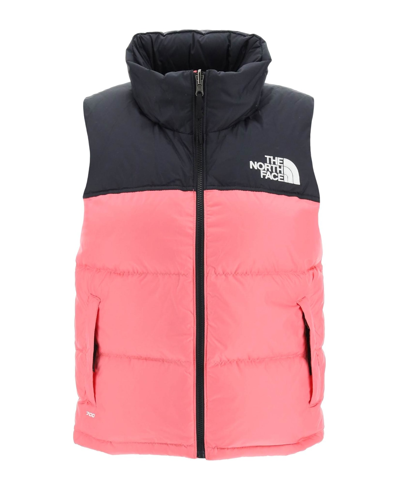 THE NORTH FACE down vest made from ripstop nylon with a durable water-repellent finish and goose down padding. Comfortable fit, zip closure, foldable hood inside the raised collar, side pockets with concealed zip. Logo lettering embroidered on the front and on the back shoulder. Nylon-lined interior with a zip pocket and drawstring hem. The model is 177 cm tall and wears a size XS.