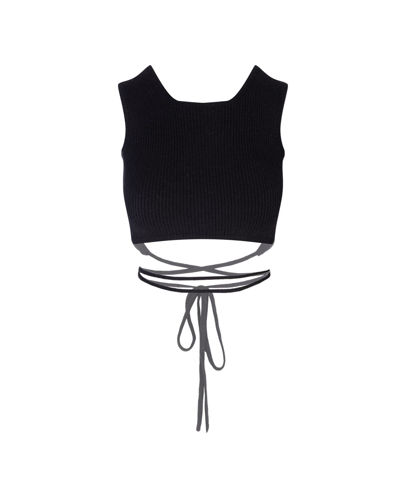 A Paper Kid fitted crop top made from black cotton with a ribbed knit. The garment features a round neckline, camisole design and straight hem with cross-over ribbon to tie at the front or back.
