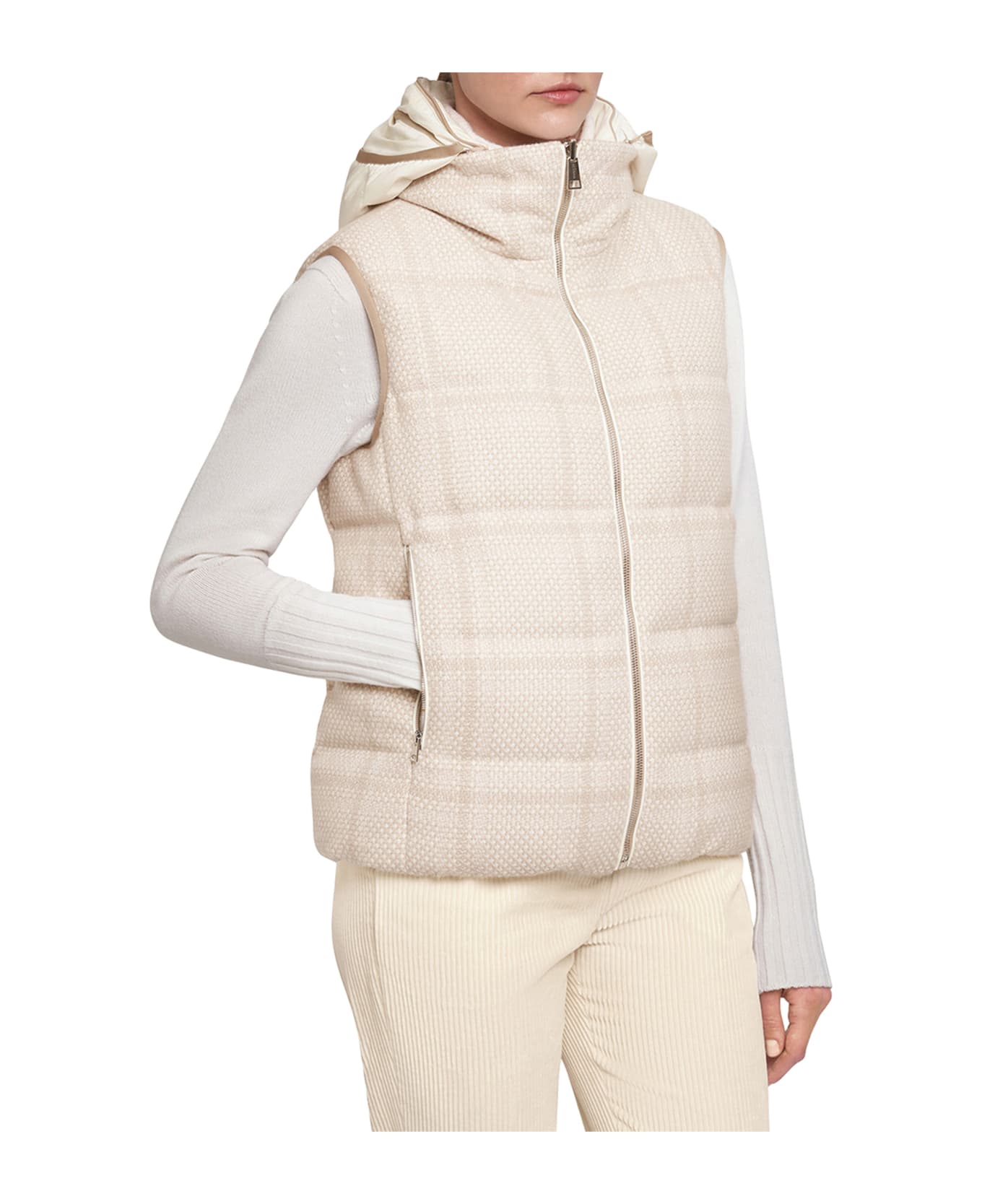 Reversible sleeveless hooded jacket made from an exclusive blend of cashmere, wool, silk and linen in white. The hood and the inner layer are waterproof and breathable, and they are distinguished by their unique silky handle, created by the select matt nylon that, once dyed, increases in density. The suppleness of the fabric is emphasized thanks to the lightweight twill structure, which embellishes its smooth surface. The finishes used are entirely chemical-free, designed to enhance and highlight the unique qualities of the cashmere composition. Zips fasten the front opening and the welt pockets at the sides. The garment has been cut, assembled and sewn in our manufacturing facility in Collecchio thanks to technical processes that give it a sartorial soul. The garment has been cut, assembled and sewn in our manufacturing facility in Collecchio thanks to technical processes that give it a sartorial soul. To maintain the beauty of your Kiton garment, we recommend professional launderingand pressing.
