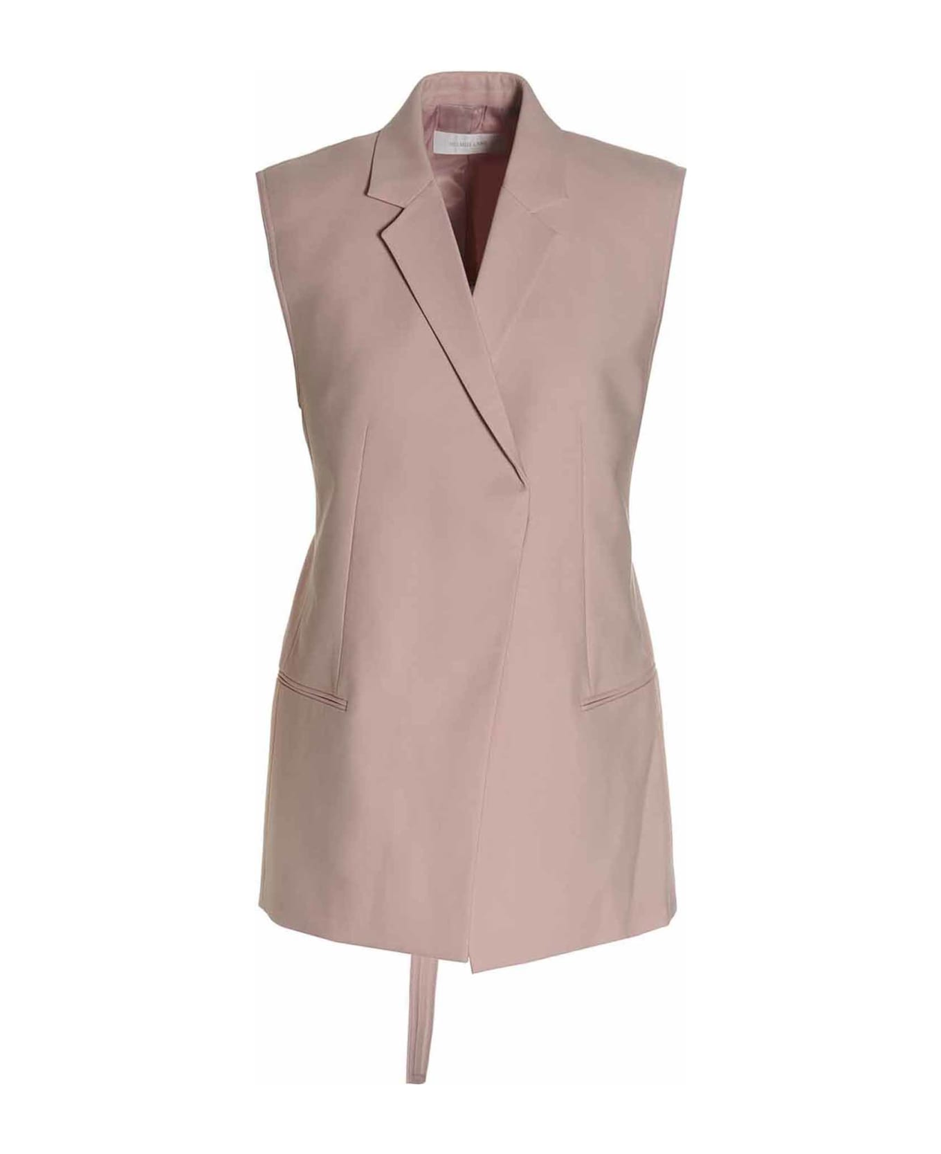 Double-breasted vest in stretch wool blend vest with belt detail on the back.