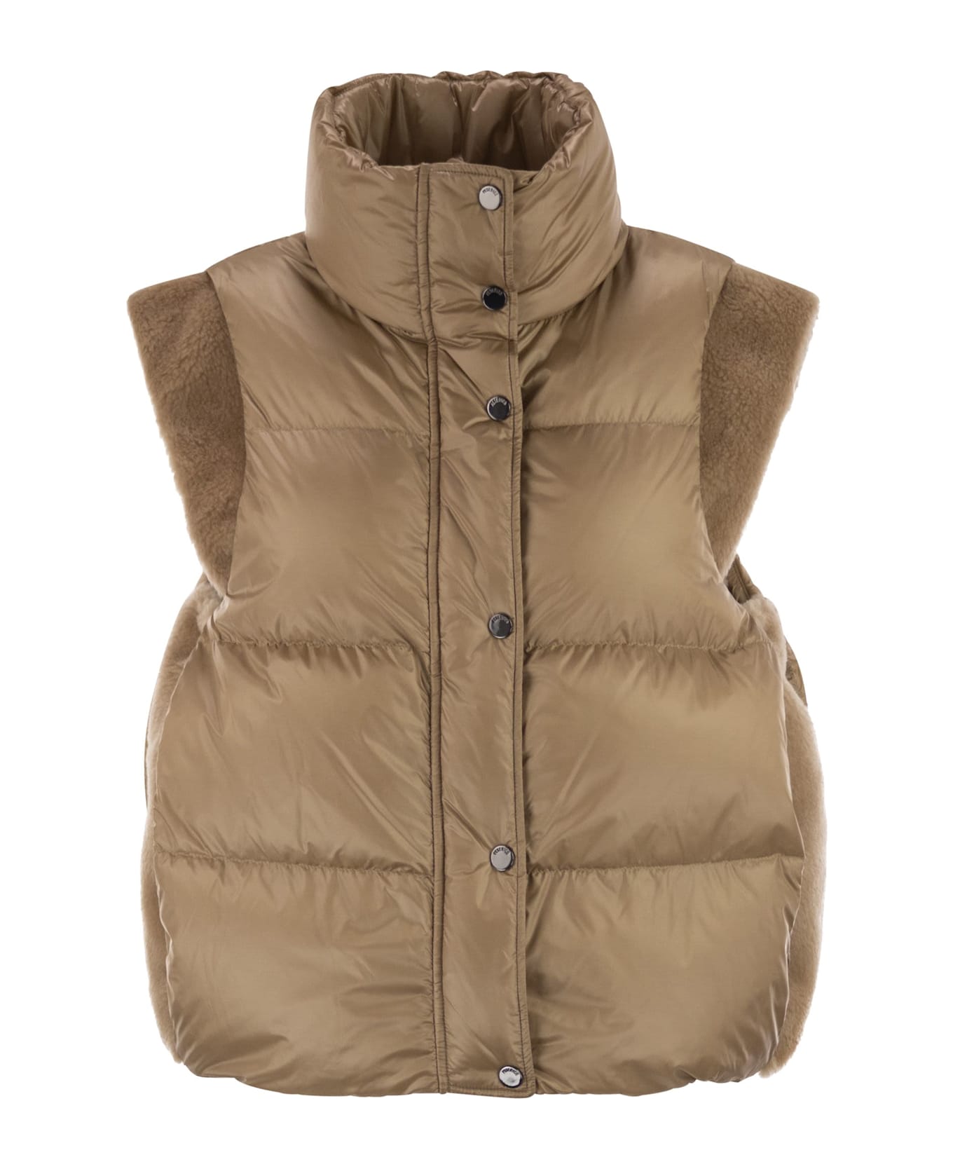 This ultra-soft short down jacket with wing sleeves and a high collar is ideal for cool mid-season days. The water-repellent coating and soft goose down filling guarantee optimal protection and cosy comfort. Designed for those looking for practical and versatile garments, this down jacket is a real must-have for mid-seasons, perfect for adding a contemporary touch to everyday outfits. - Snap button closure - Sleeveless - High collar - Wing sleeves DESIGNER ID: S034522200M 46M