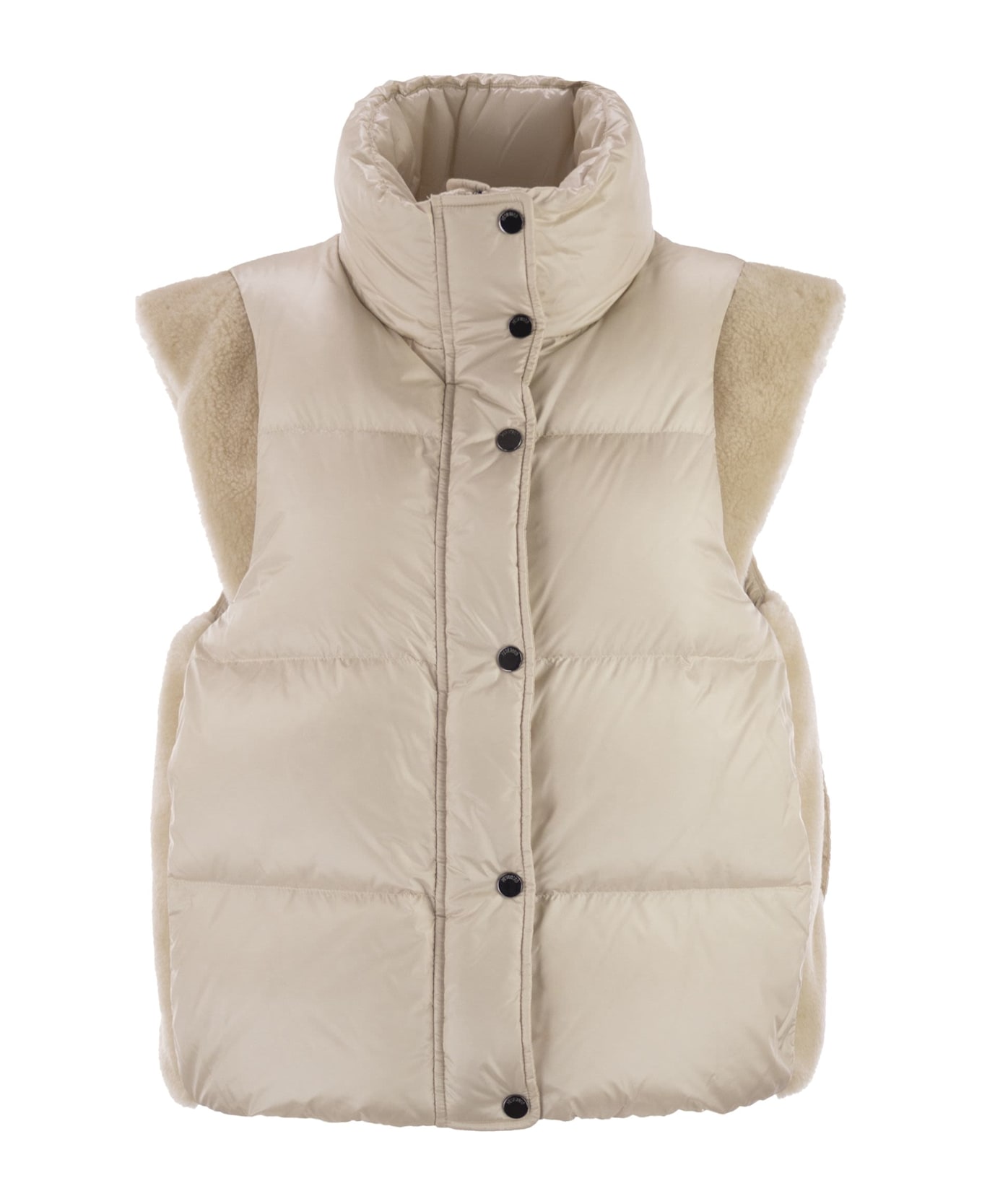 This ultra-soft short down jacket with wing sleeves and a high collar is ideal for cool mid-season days. The water-repellent coating and soft goose down filling guarantee optimal protection and cosy comfort. Designed for those looking for practical and versatile garments, this down jacket is a real must-have for mid-seasons, perfect for adding a contemporary touch to everyday outfits. - Snap button closure - Sleeveless - High collar - Wing sleeves DESIGNER ID: S034522200M 43M