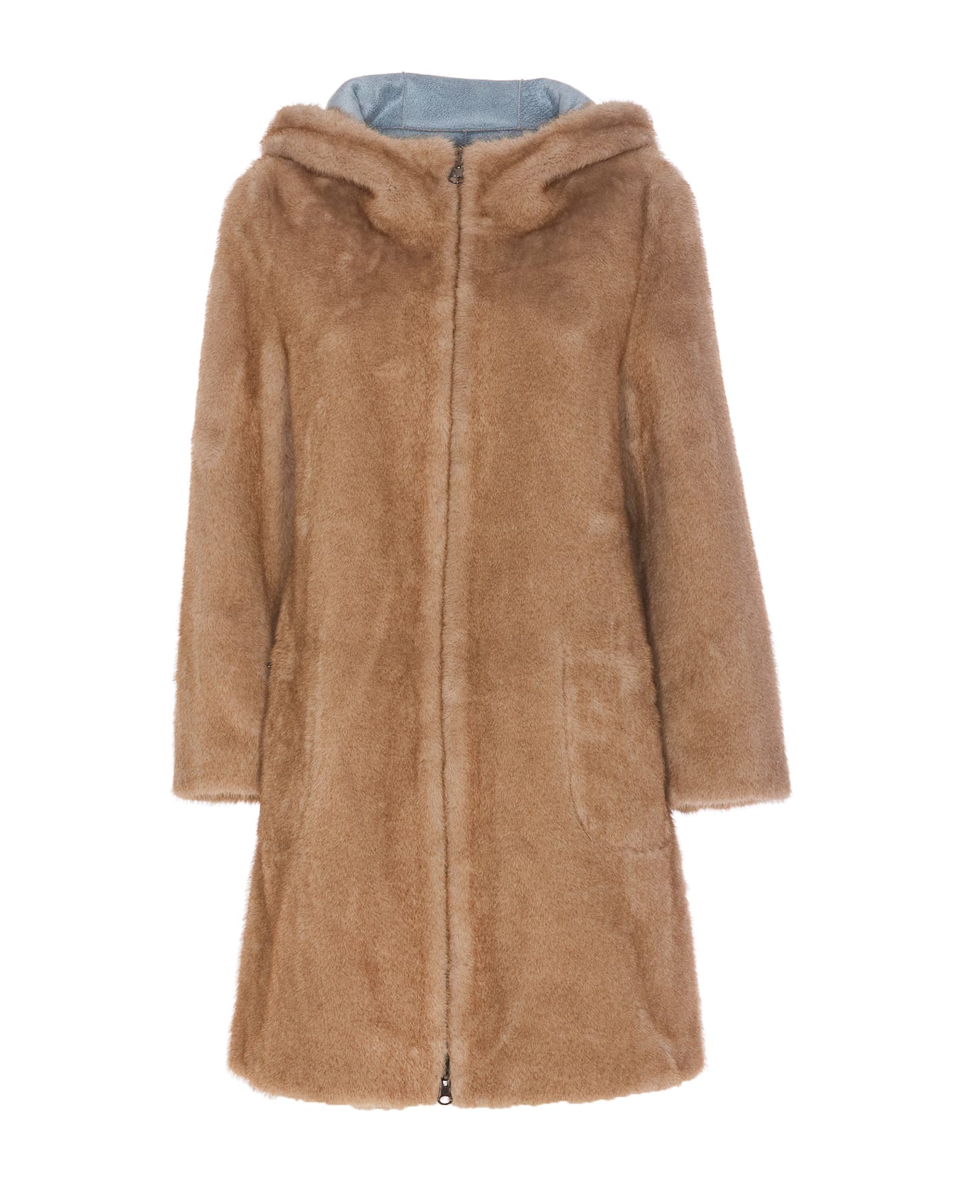 Bully beige fake fur jacket with frontal zip closure, hood detail, long sleeves, lateral zip pockets