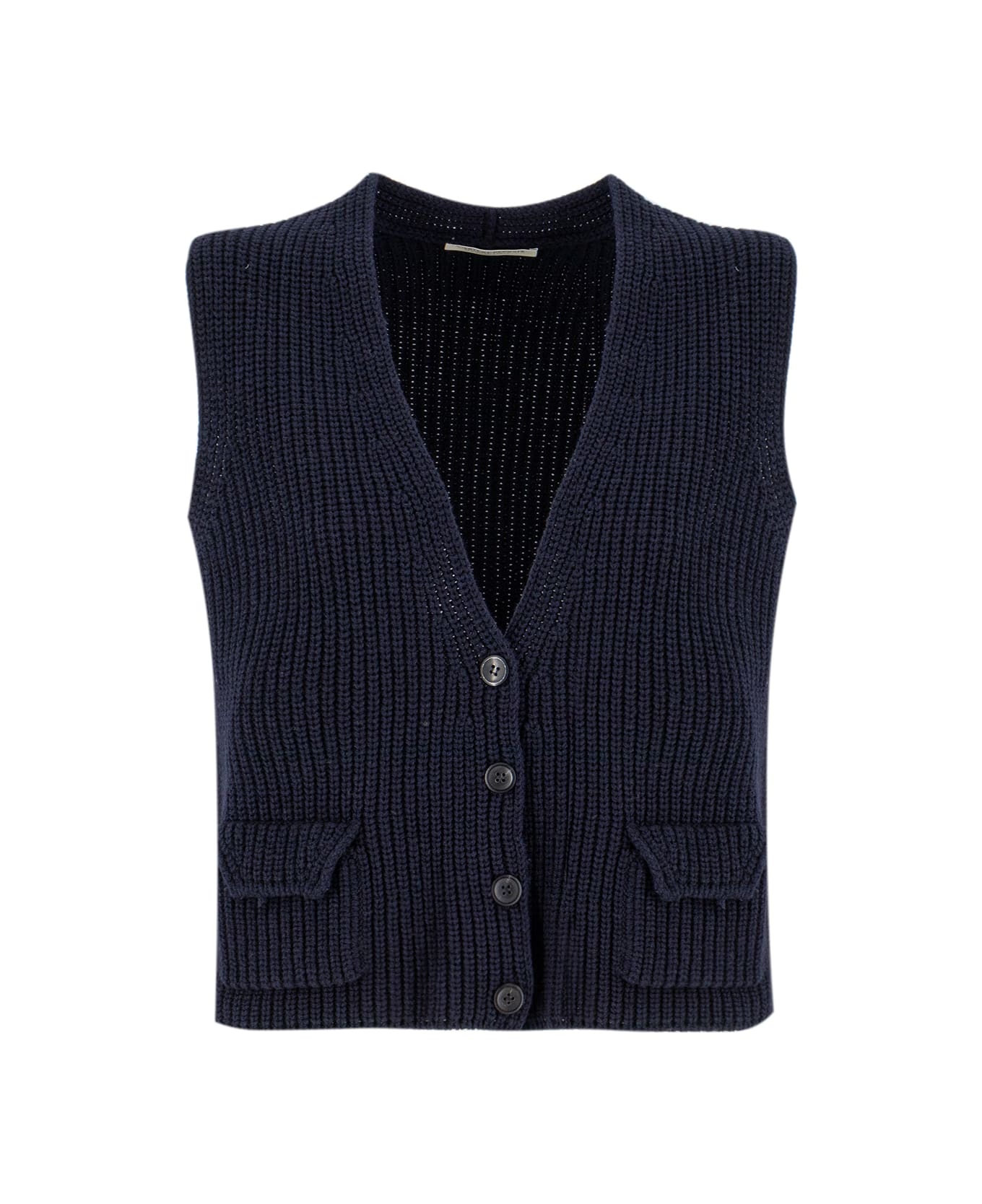 Delicate knitted waistcoat made of fine yarns. Deep neckline and button fastening, featuring small side pockets.