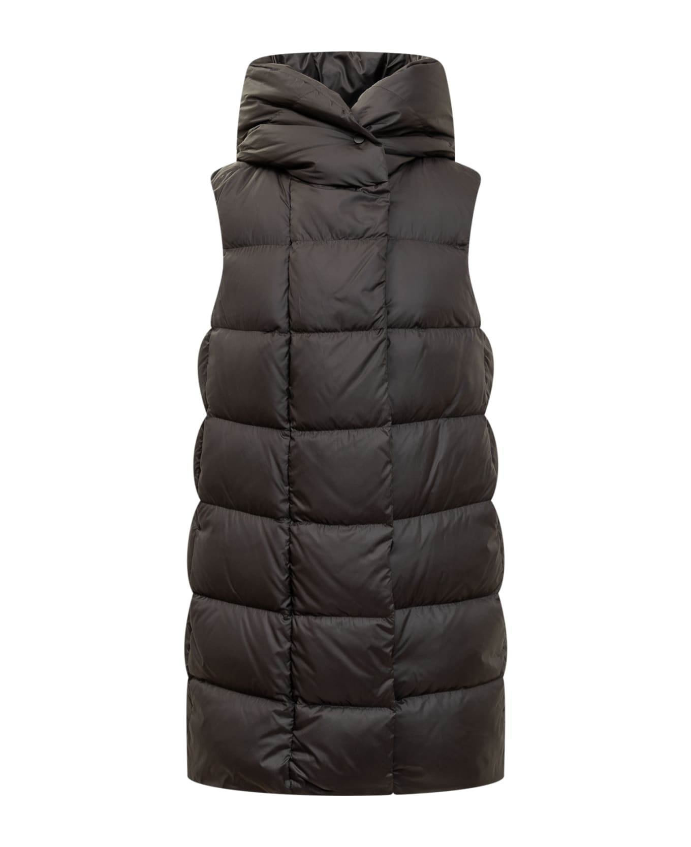 Black sleeveless down jacket. Hood with button. Front closure with zip and buttons. Side pockets.