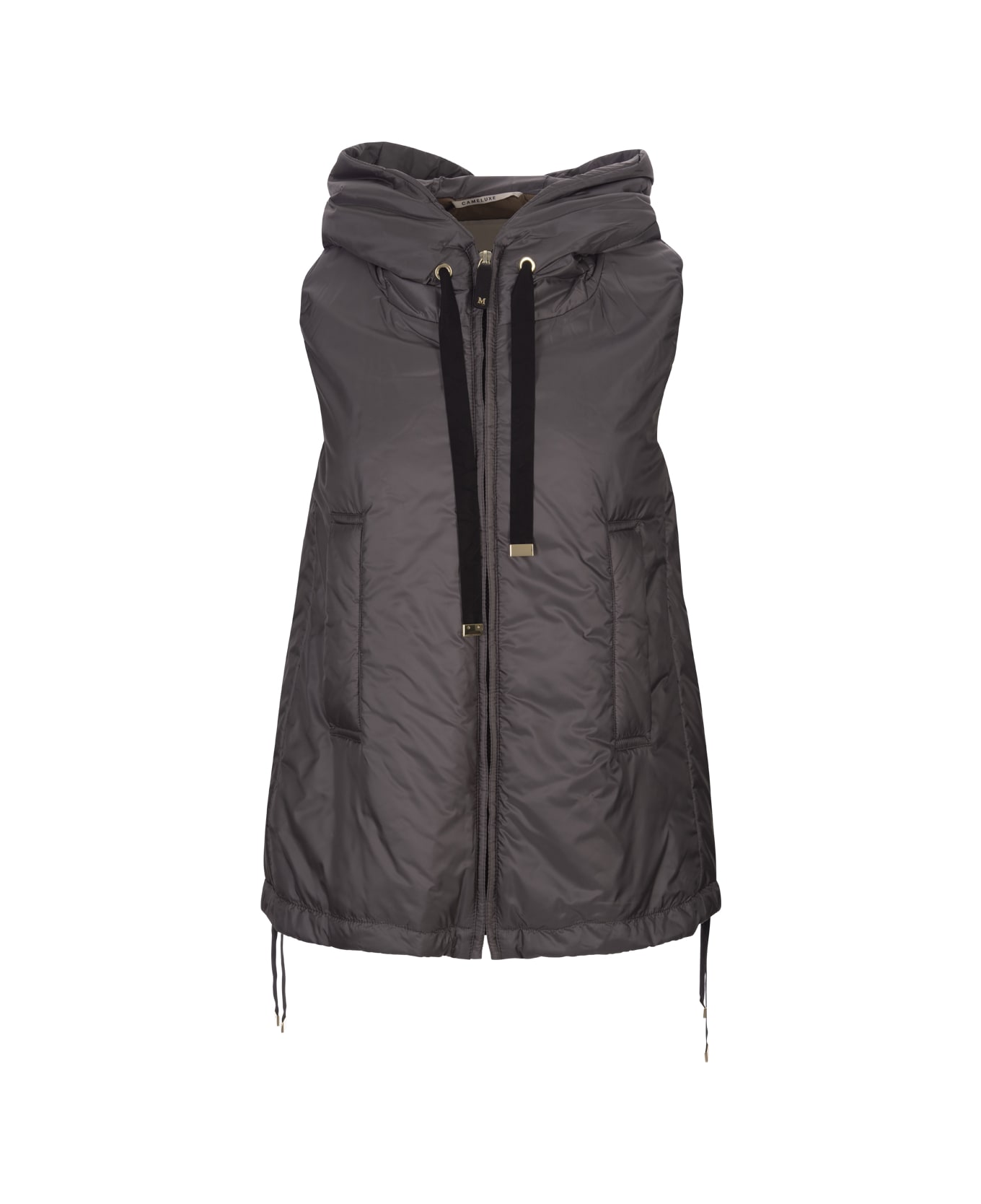 Grey Greengo short gilet by Max Mara made of drip-proof technical canvas, with drawstring hood and welt pockets. Model finished with a drawstring hem and zip fastening. The gilet features CameLuxe padding: a new frontier for upcycling processes that involves the recovery of surplus from the process of cutting the pure camel fabrics of the brand's legendary coats.