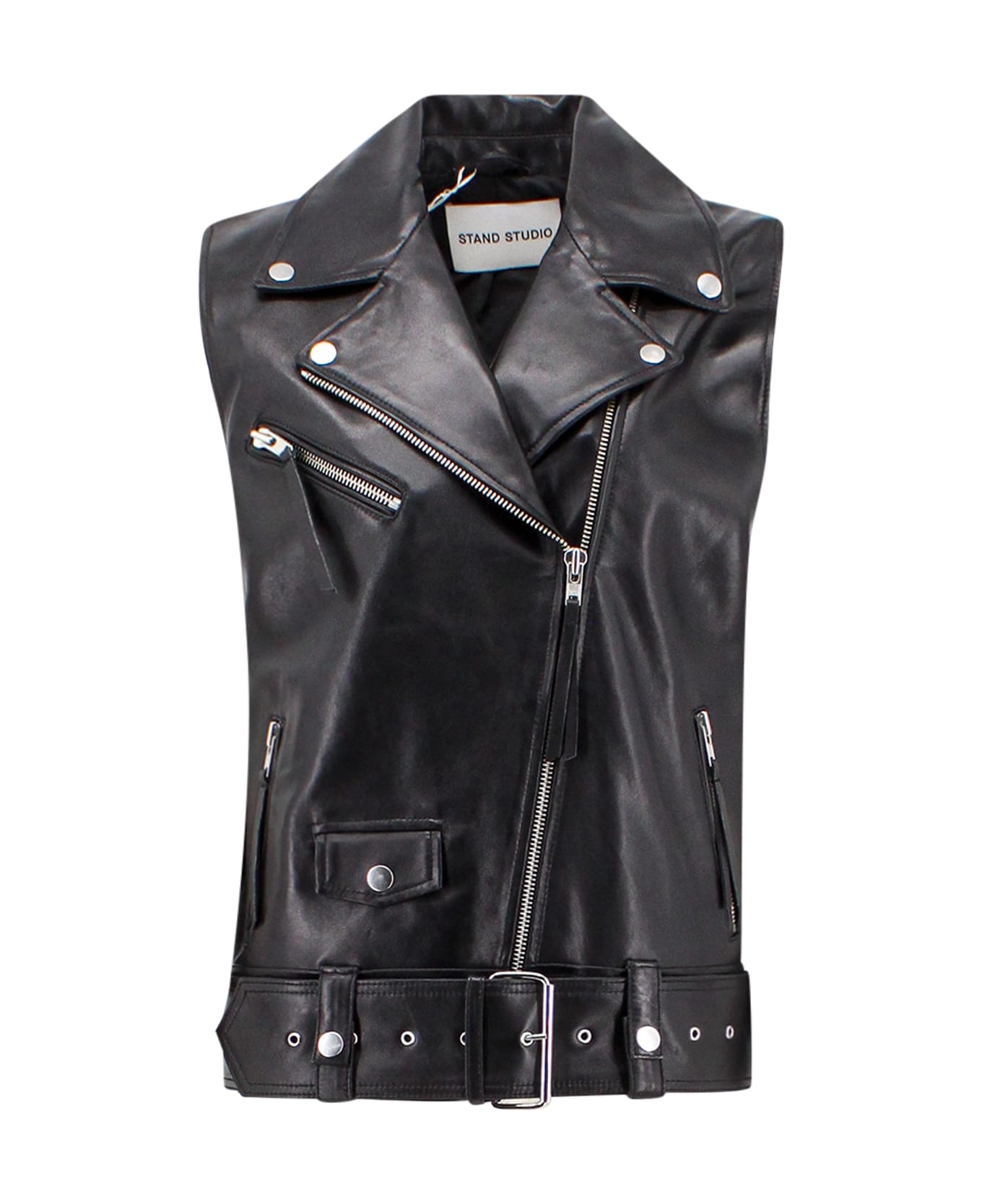 Sleeveless leather jacket with metal details