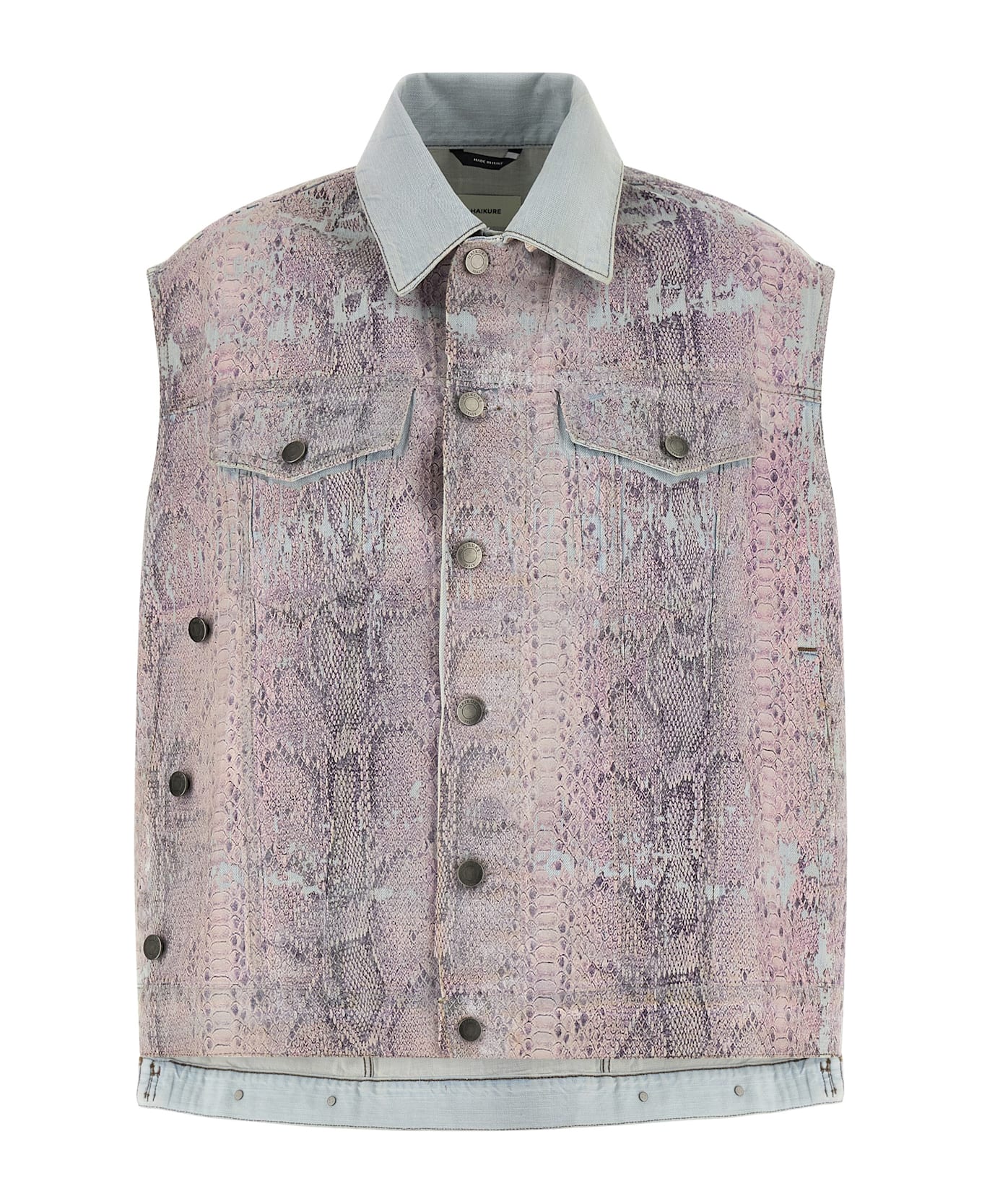 Janette' cotton denim vest with all-over python print, shirt collar, two-level front button closure, pockets, and back leather logo tag. Since the print film is pressed it will stick to the garment in a different way, this makes each piece unique.