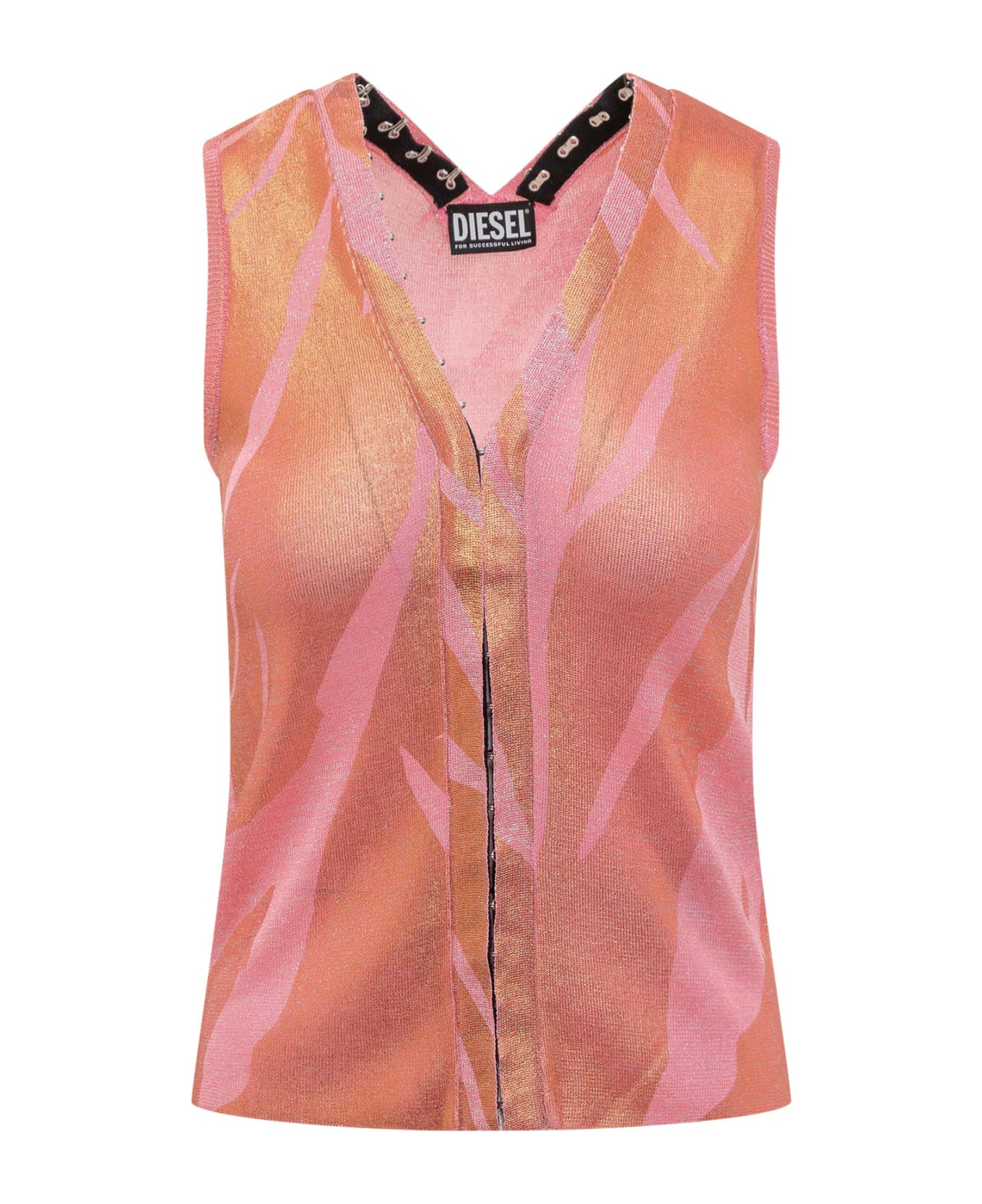 Sleeveless top. V-neck. Internal hooks on the neckline and closure. Two-tone all-over metallic cut-out effect. Laminate effect. Composition: 80% Acetate, 10% Polyamide, 10% Fibra Metallizzata