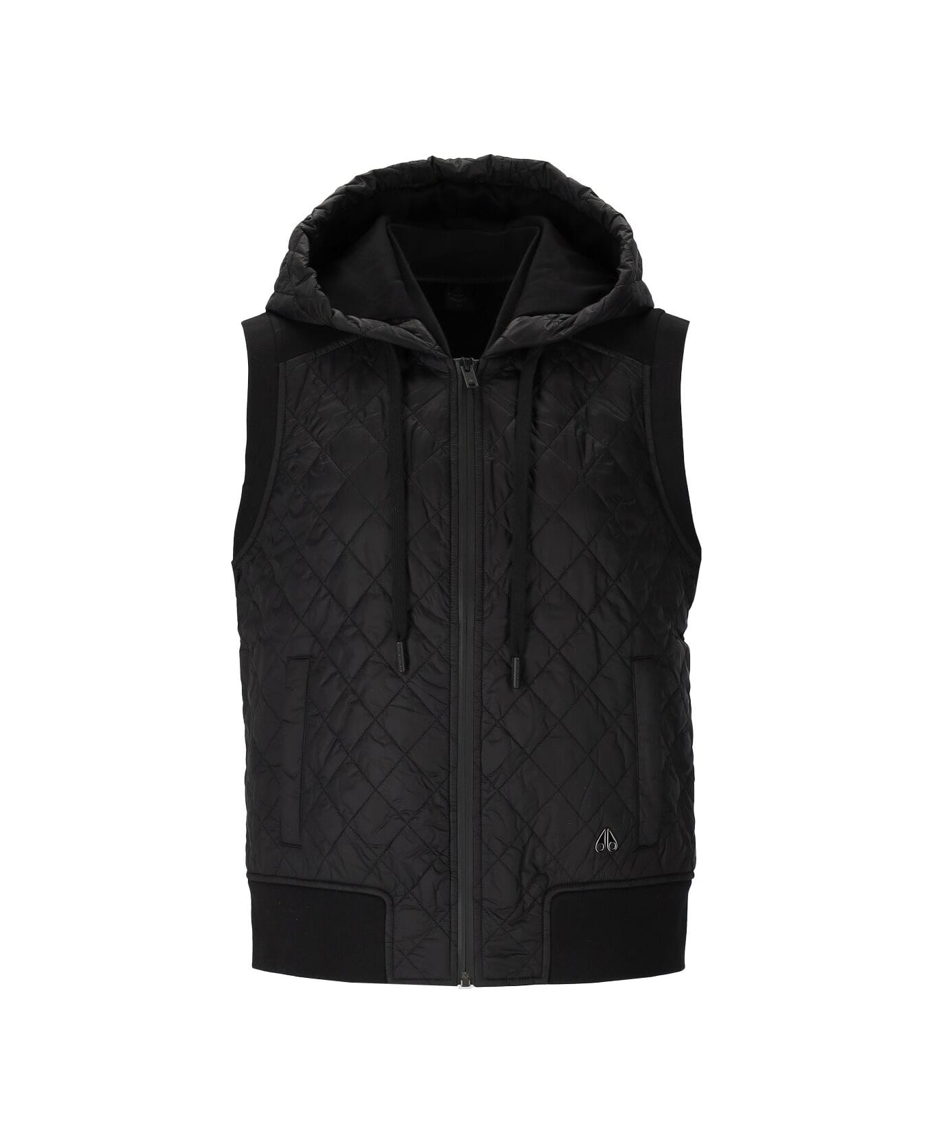 Rock Point vest by Moose Knuckles made of quilted black nylon, with cotton back. Adjustable hood with drawstring, metal logo on the chest and welt pockets. Zip closure, ribbed bottom. External front and lining composition: 100% recycled nylon. External back composition: 100% cotton. Filling: 100% polyester.