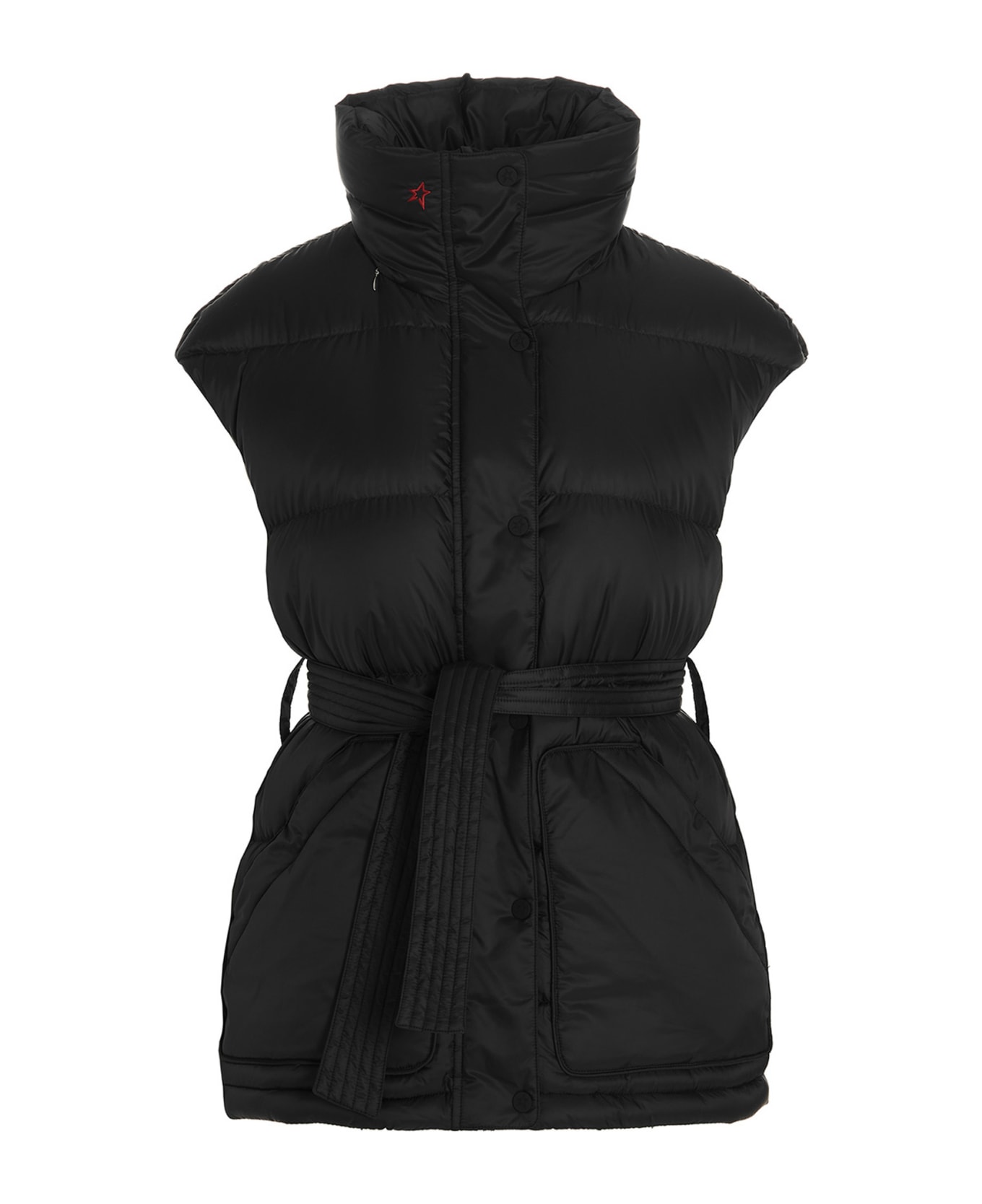 Over Size Vest II' nylon vest with goose down padding, zip and button closure, removable waist belt, pockets, high collar, removable hood and a contrast logo embroidery. sting logo embroidery.