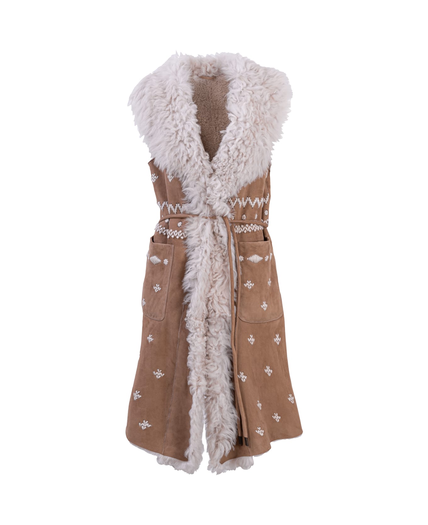 Benedetta Novi sheepskin gilet with embroidery. Collar with lapel. Sleeveless. Low pockets. She belted at the waist. Contrasting color embroidery. Composition: 100% Leather. Made in Trkiye.
