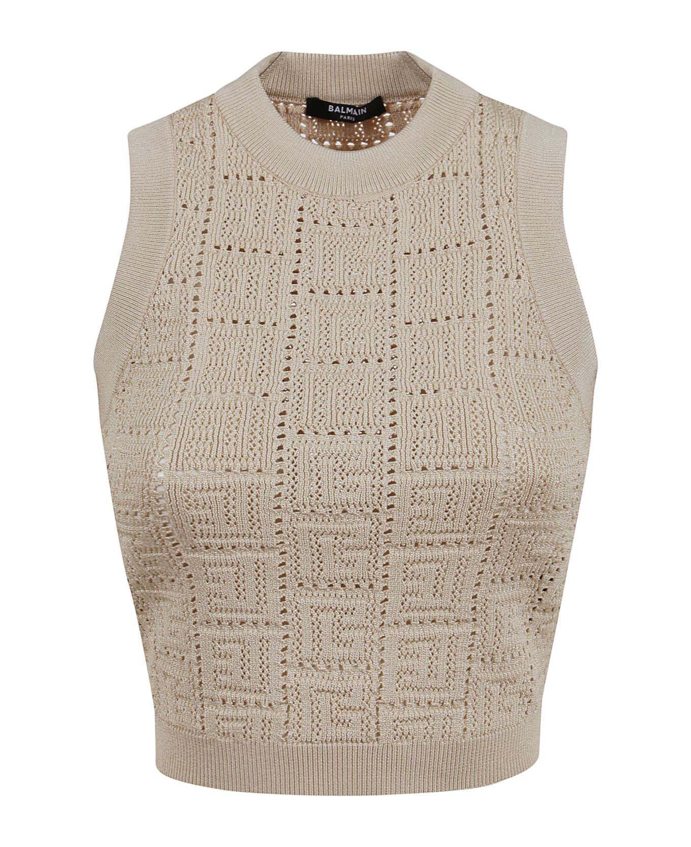 Openwork knit top BY BALMAIN. crewneck; sleeveless. Fitted design close to the body, cinched at the waist, cropped cut. Monogram motif detail and contrasting ribbed finish.