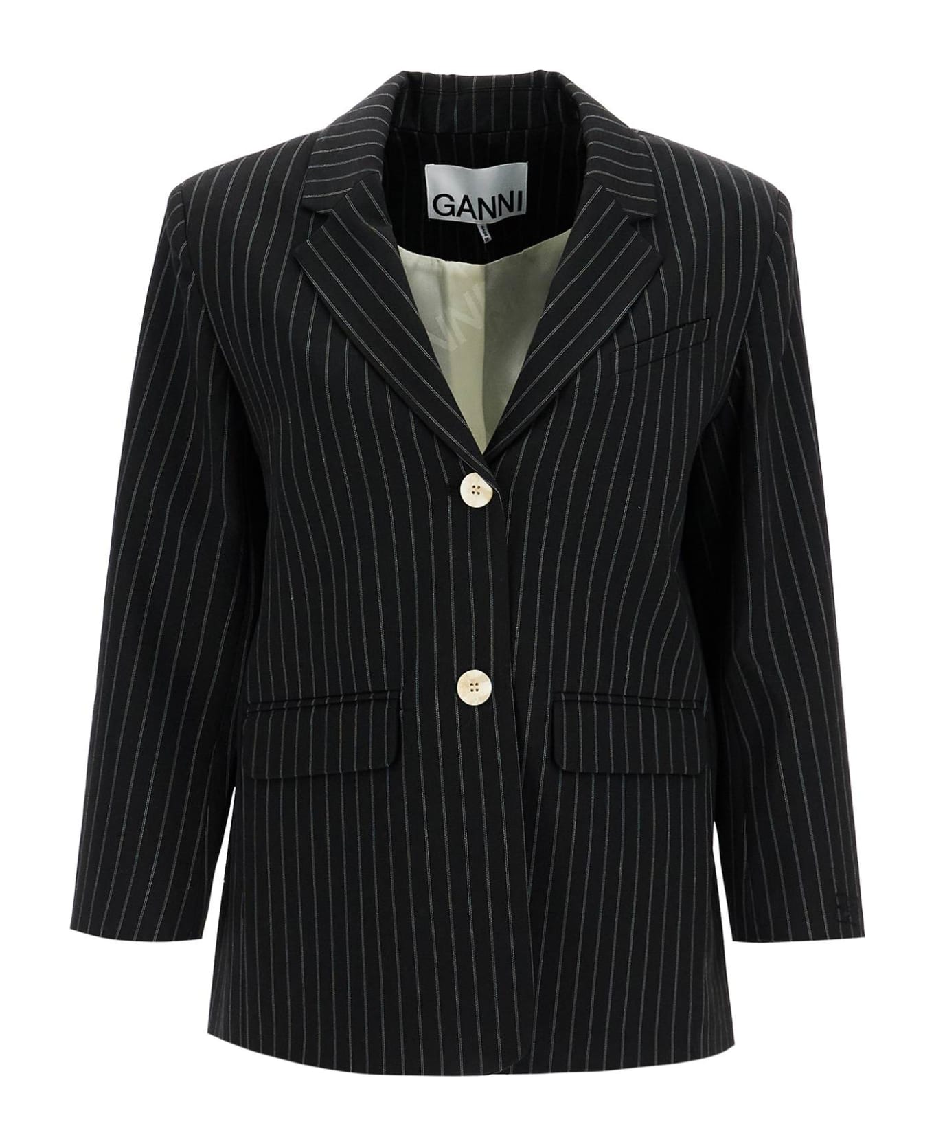 The boxy cut with padded shoulders and 7/8 sleeves gives a contemporary touch to this Ganni blazer, made of sustainable stretch twill with a delicate pinstripe pattern. The jacket features a single-breasted construction with two buttons, classic lapels, and a double back vent. Two flap pockets and a chest pocket complete the piece. The model is 177 cm tall and wears size EU 34.