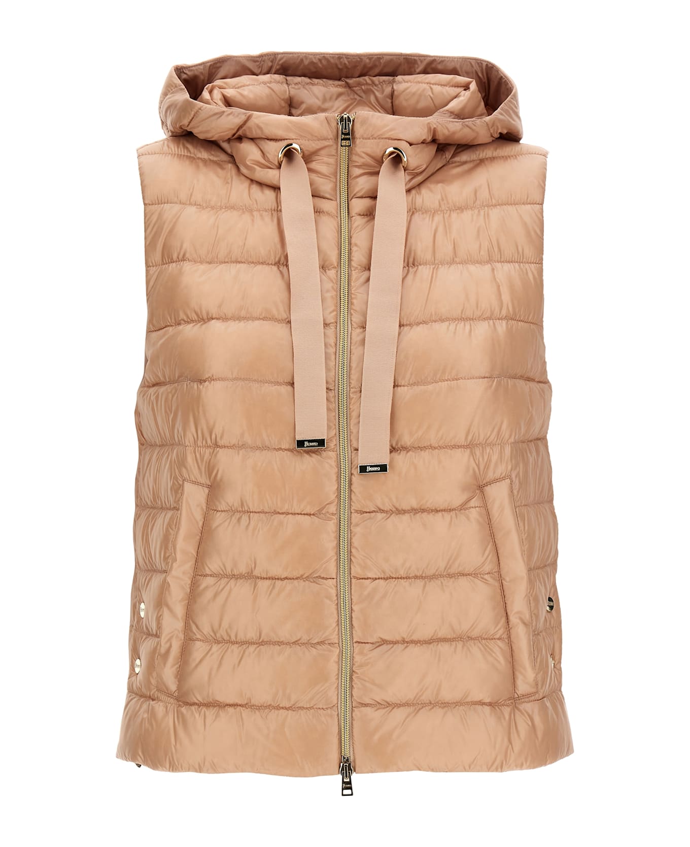 Ultralight nylon hooded vest with down padding, zip closure, pockets, side slits with snap button closure and logo grosgrain tape. Composition: 100% polyamide