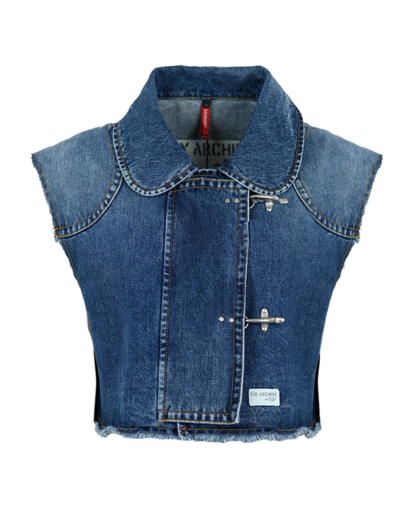 vest 2 denim hooks: over fit two hooks denim automatic buttons fringed edges details in suede leather item composition: 100% cotton