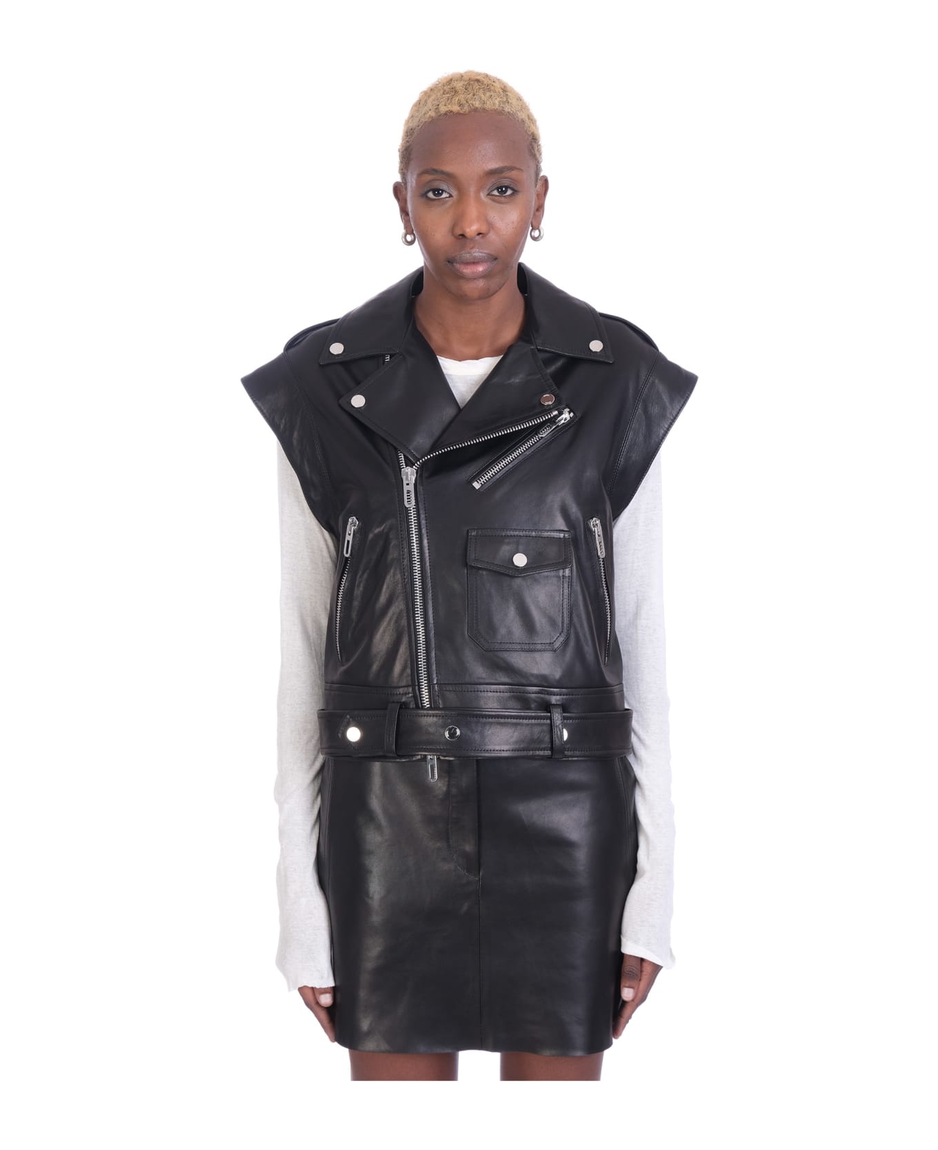 Vest in black leather, revers with automatic buttons, zip clousure, pockets, belt waist, sleeveless, silver hardware, 100% Lamb Leather, Made in Italy, Model is 180 cm and wears M