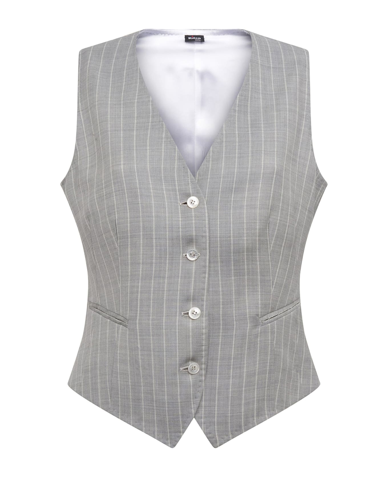 Single-breasted waistcoat made from soft grey wool with a pinstripe pattern. Finely crafted textiles have always been a cornerstone at Kiton: in our wool mill in Biella, Italy, constant experimentation has given rise to the creation of innovative textures and fibres, paying special attention to sustainability and the environment. The garment, entirely cut and sewn in Naples by our artisans, is lined in pure white silk satin and is characterised by the absence of lapels, the presence of four mother-of-pearl buttons and double welt pockets. Perfect for both formal occasions and leisure time thanks to its elegant and sophisticated twist, the waistcoat can be worn under a matching blazer or simply over a mini dress. This Kiton garment speaks to refined women with strong, passionate character, attentive connoisseurs of sartorial traditions. To maintain the beauty of your Kiton jacket, we recommend professional laundering and pressing.