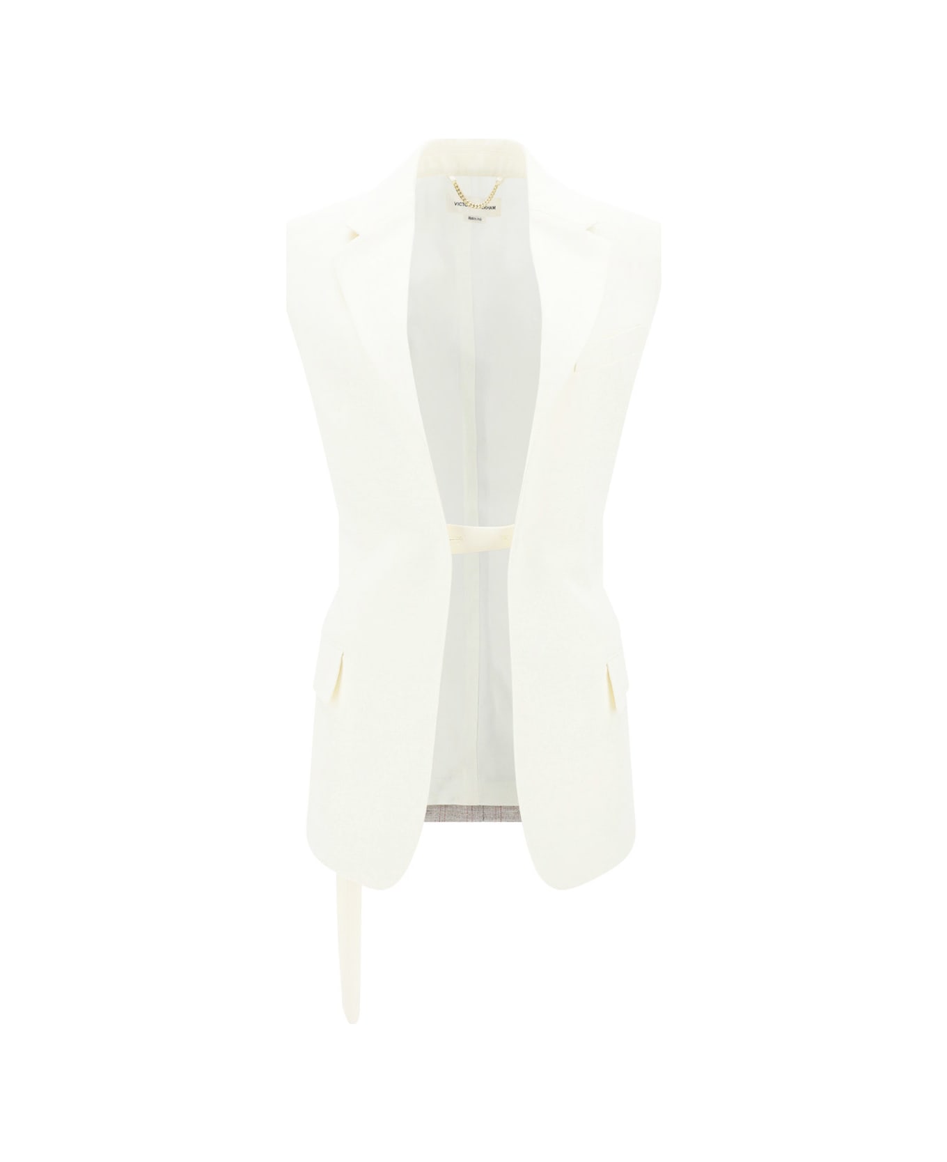 Vest by victoria beckham, v-neck on front, front button closure, two side welt pockets, contrasting back panel, monochrome pattern, martingale applied on back.