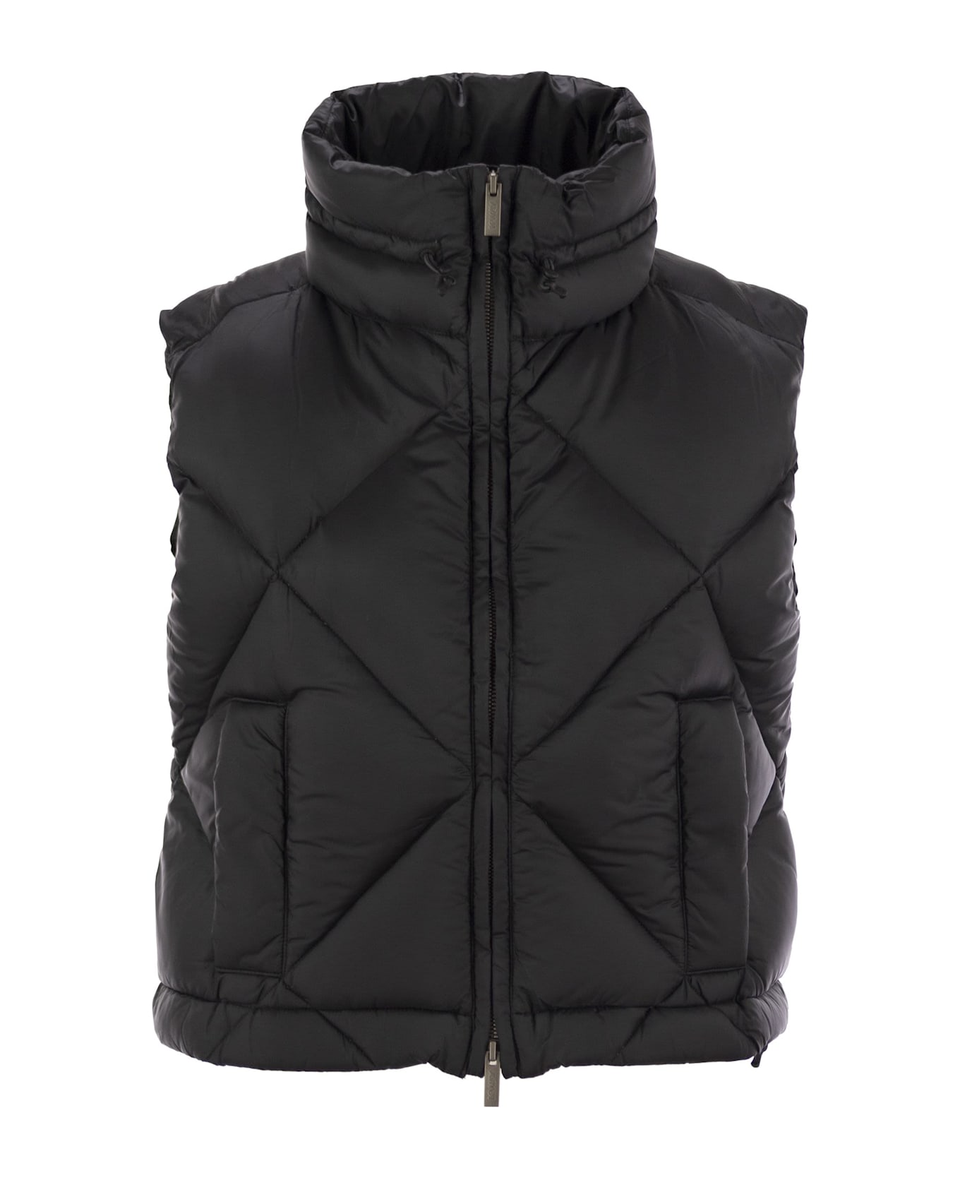 Will is a short women's gilet ideal for winter, with a soft and contemporary look and a quilted yet essential design. This regular-fit waistcoat features Molina down padding and an extremely light and fluffy look conferred by the silky soft nylon exterior. The model has a high collar and 2 side pockets. - Silky nylon fabric - Molina down filling - Diamond quilting - Zip closure - 2 pockets with snap buttons - Regular fit DESIGNER ID: K8136GW AT0