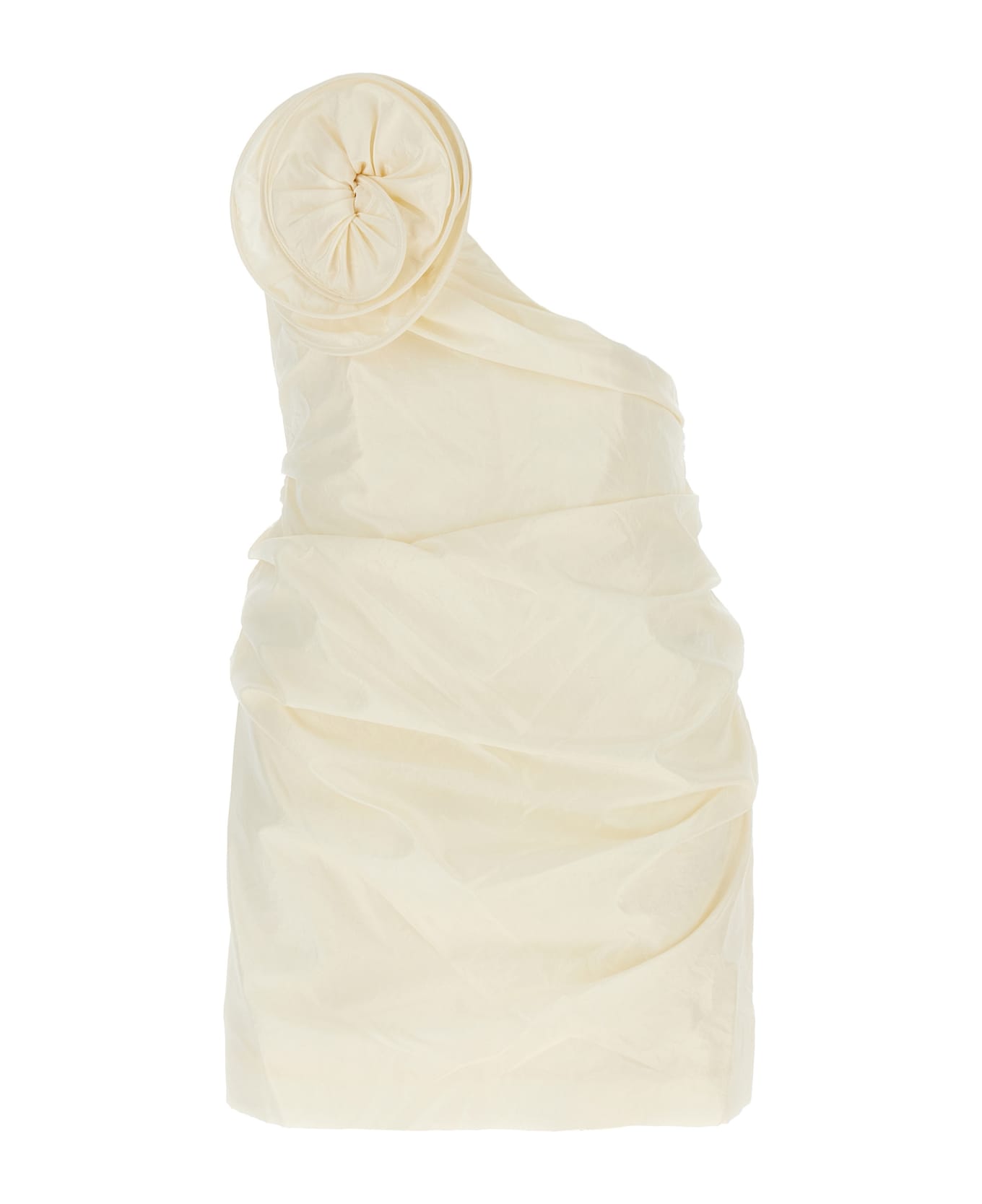 '06' silk taffeta crinkle dress with asymmetric off-the-shoulder neckline to be superimposed on a top, with front floral appliqué, back zip closure. Composition: 100% silk