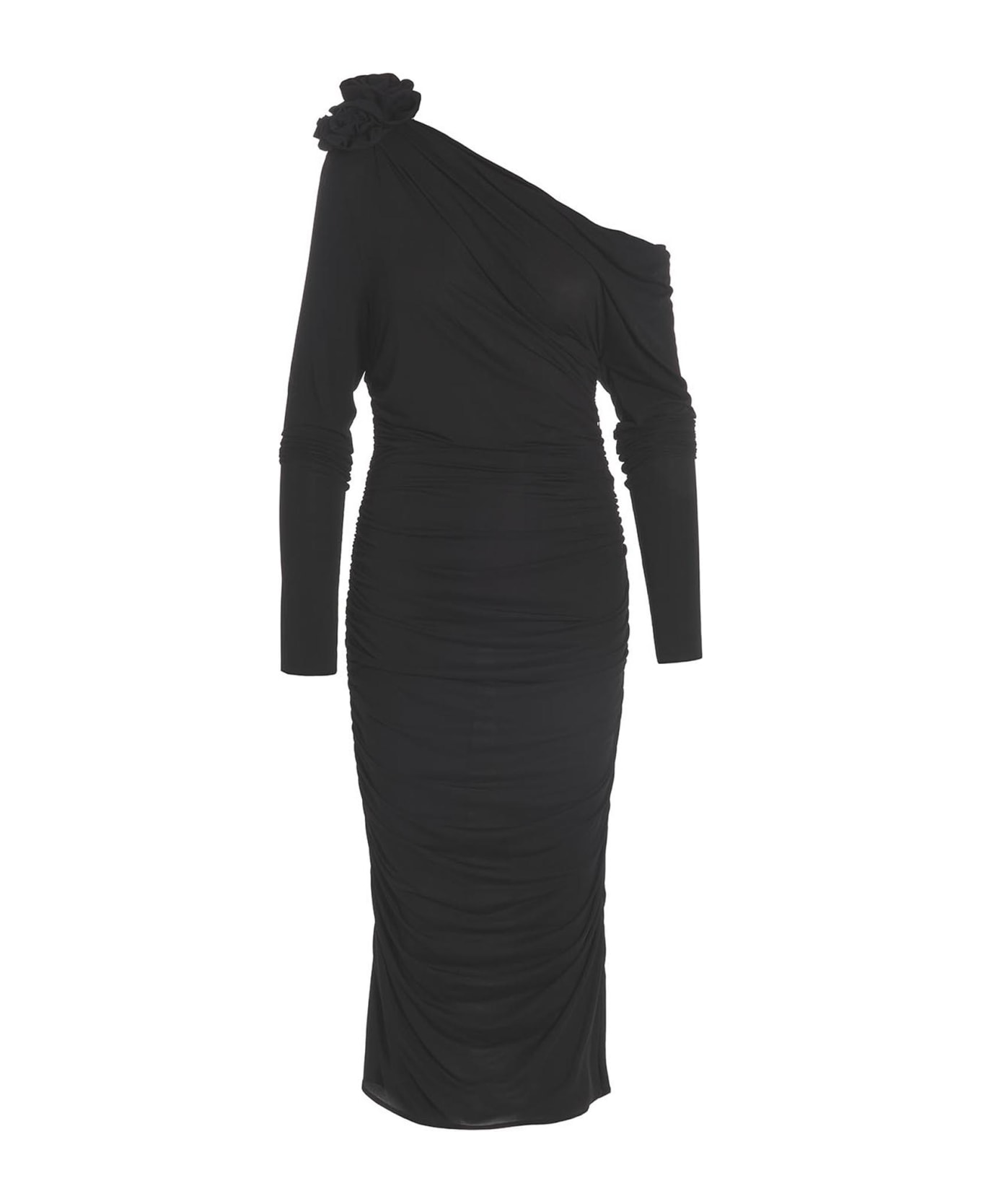 11' viscose blend dress with all-over draping, soft neckline, long sleeves, a removable flower-shaped pin application and a side zip closure. Composition: 83% viscose 17% elastane