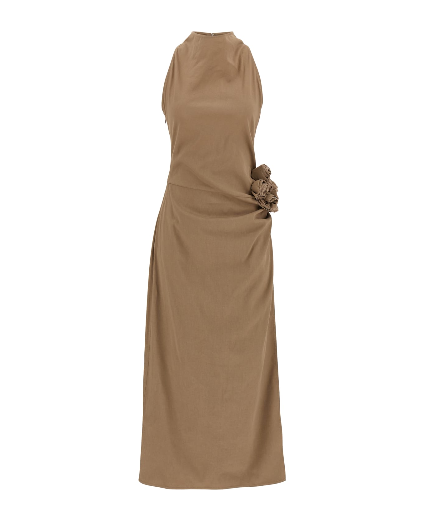 '29' sleeveless midi dress in linen and viscose blend, high neck with back hook closure, slightly draped butterfly neckline at the back, 3D flower appliqué, button closure and wide side split. Composition: 66% li, 35% vi, 5% ea