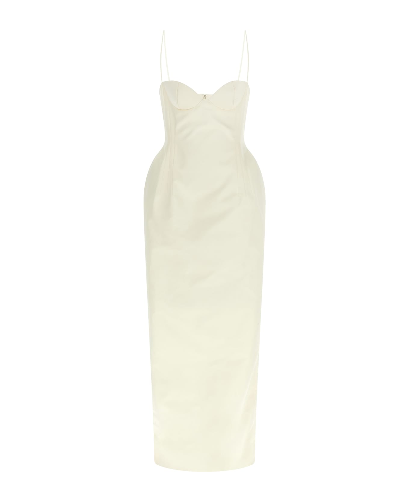 Long '30' silk dress with hourglass silhouette, sweetheart neckline, bra with tight bodice and padded cups, cushions on the sides, thin straps, sleeveless, wide slit and back zip closure. Composition: 100% silk