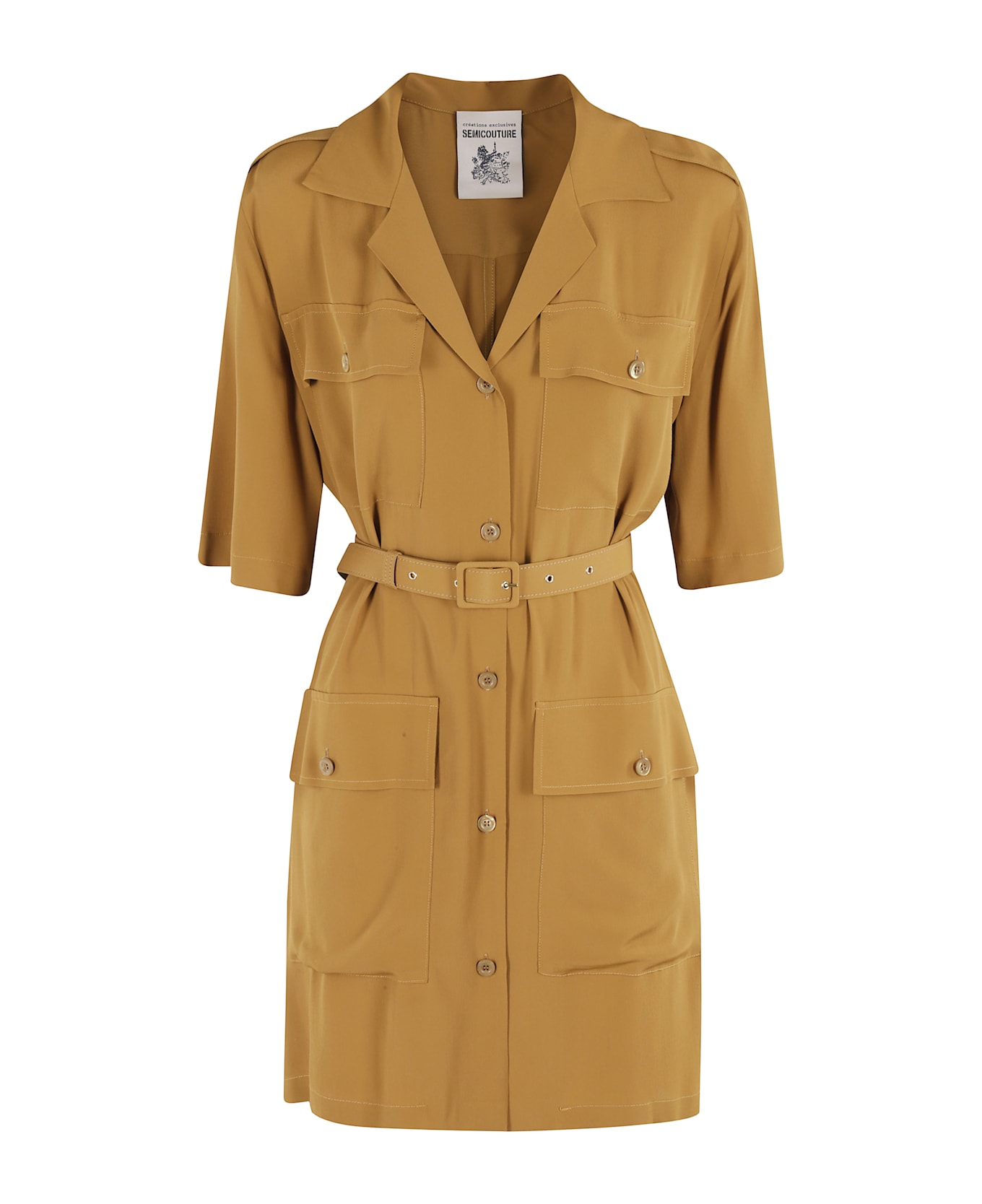 Dress - Semi Couture - Mustard color - Abbey pattern - Classic collar - Front button placket - Four flap pockets - Removable belt - Regular fit