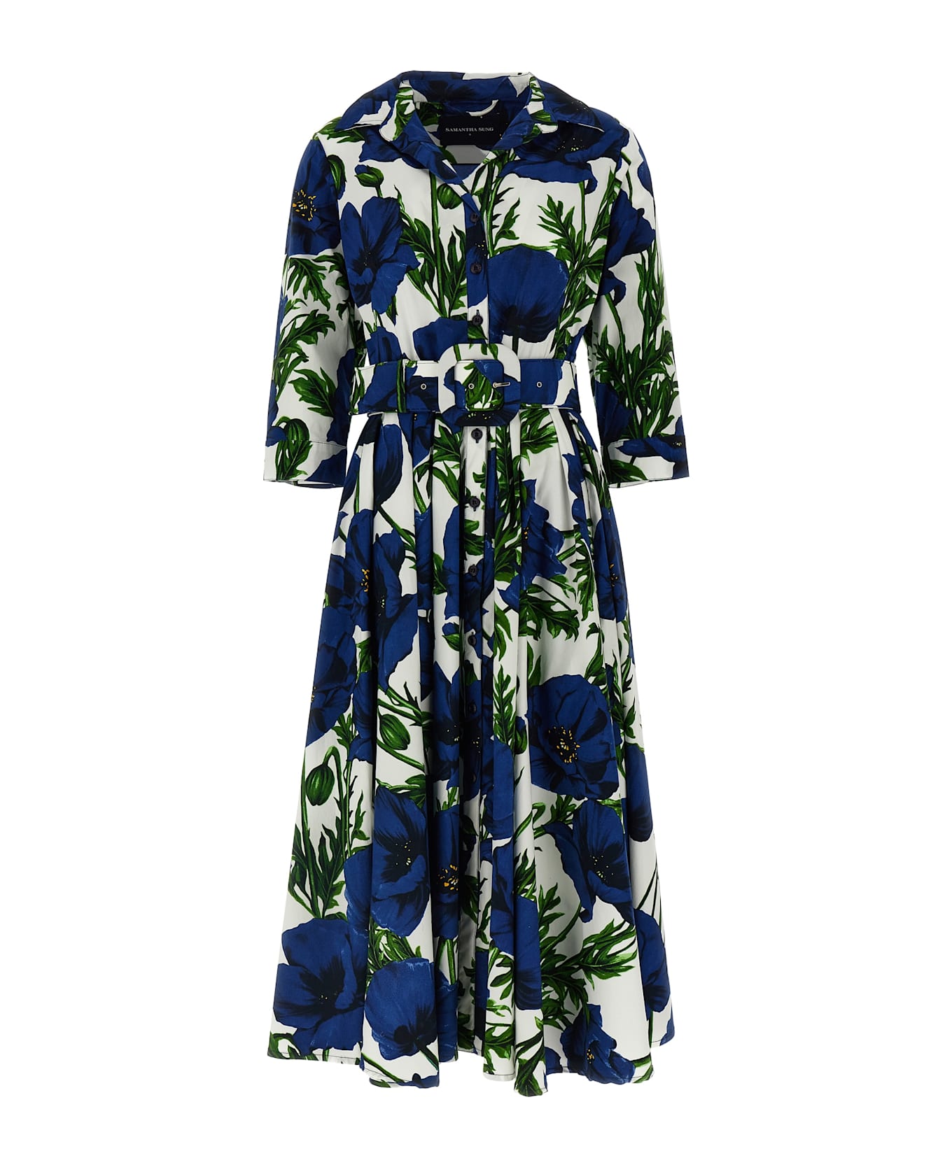 Abelia' all-over print cotton muslin midi dress with shirt style with front button closure, 3/4 sleeves, full skirt, removable matching belt and sash detail.