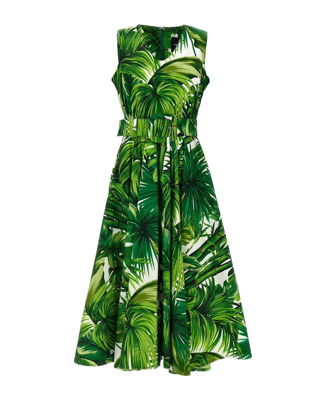 Abelia' sleeveless midi dress in all-over print cotton muslin, back zip closure, V-neck, removable matching belt and sash pockets.