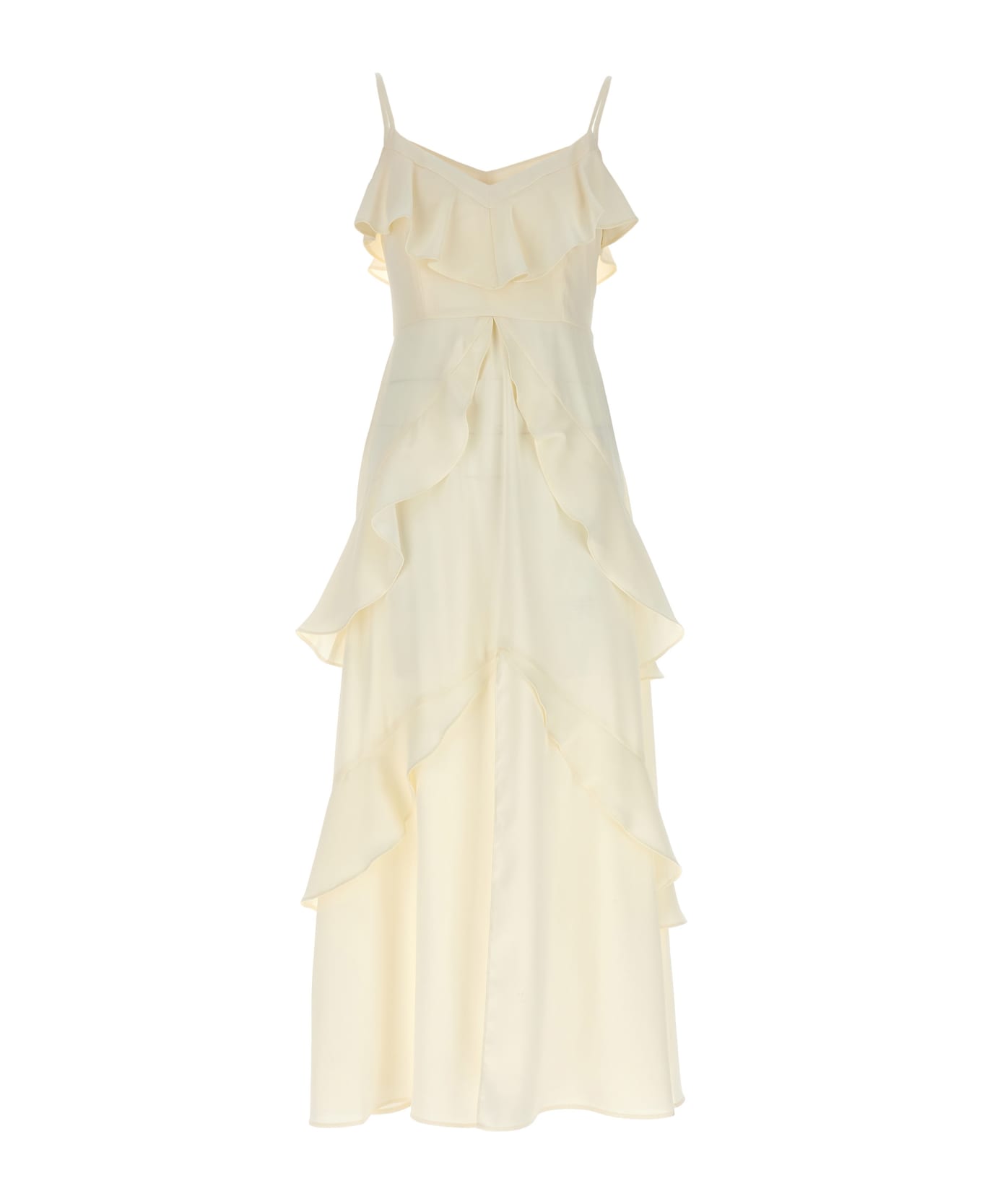 Abio made in crêpe with ruches, V-neck, thin shoulder straps and a side zip closure.