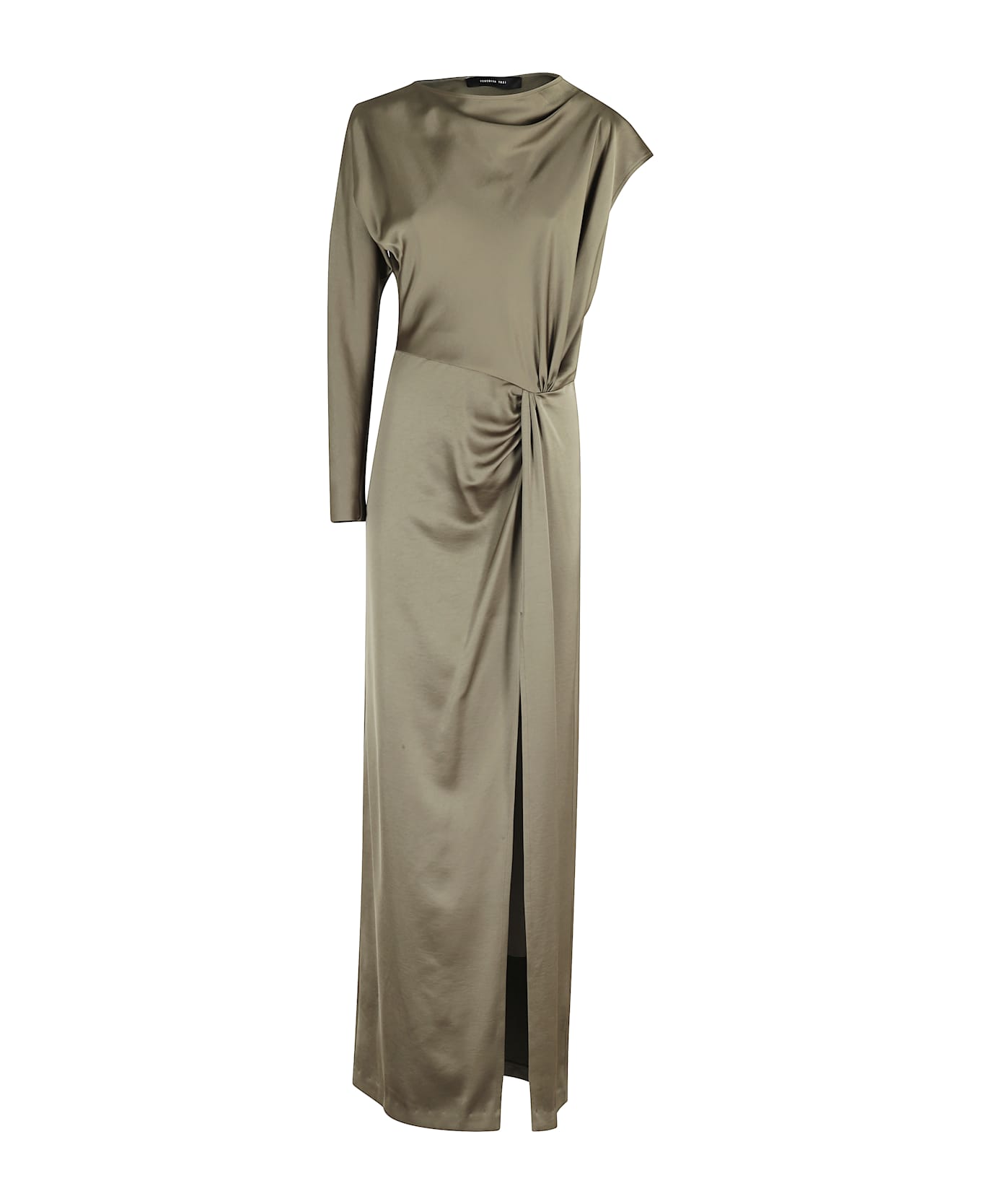 Dress - Federica Tosi - Khaki color - Satin fabric - Crew neck - One shoulder with long sleeve - Draped waist - Long skirt with slit - Side zipper closure