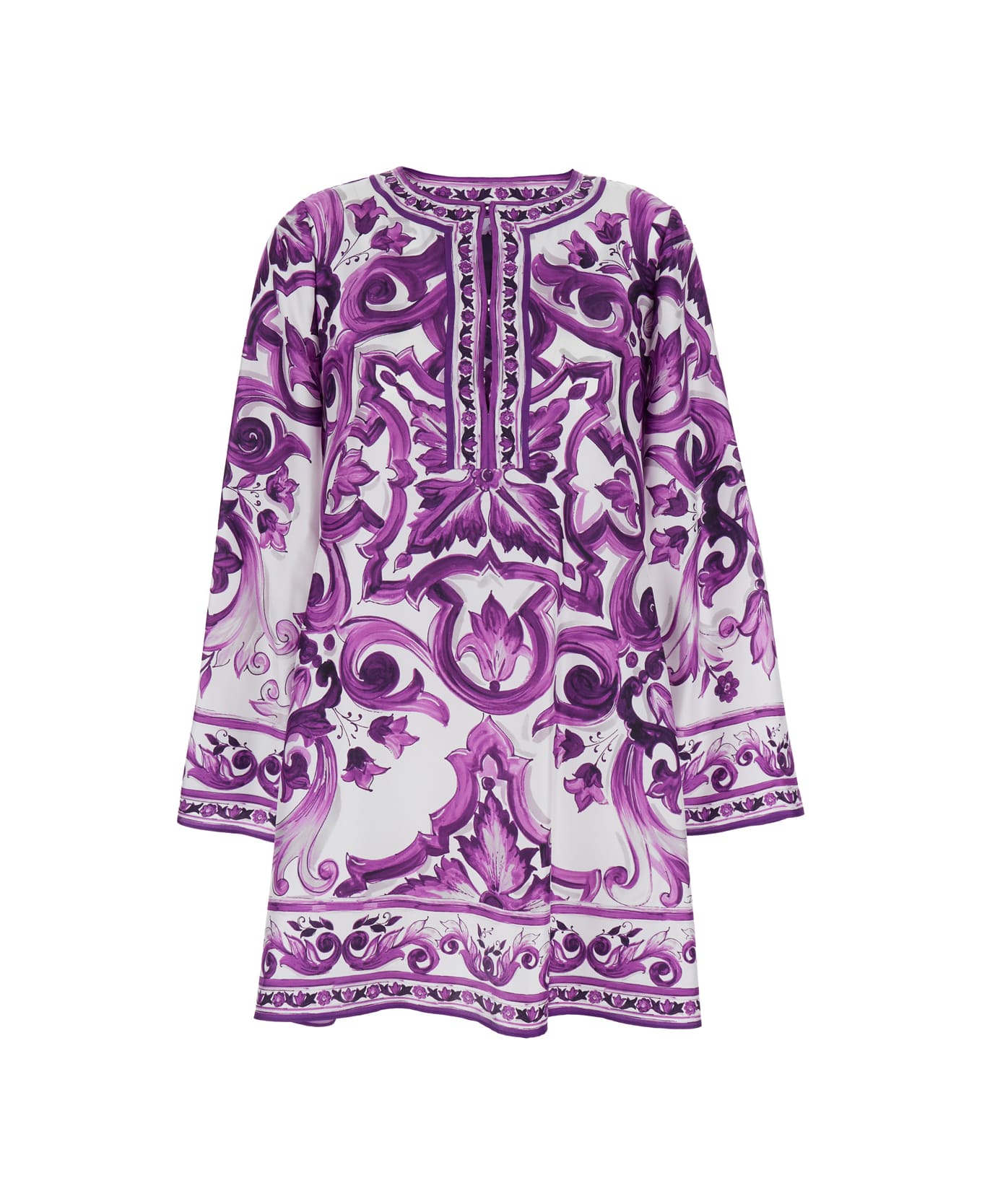 Dress Violet Round neck Long wide sleeves Front button closure Straight hem All-over floral motif Silk Relaxed fit
