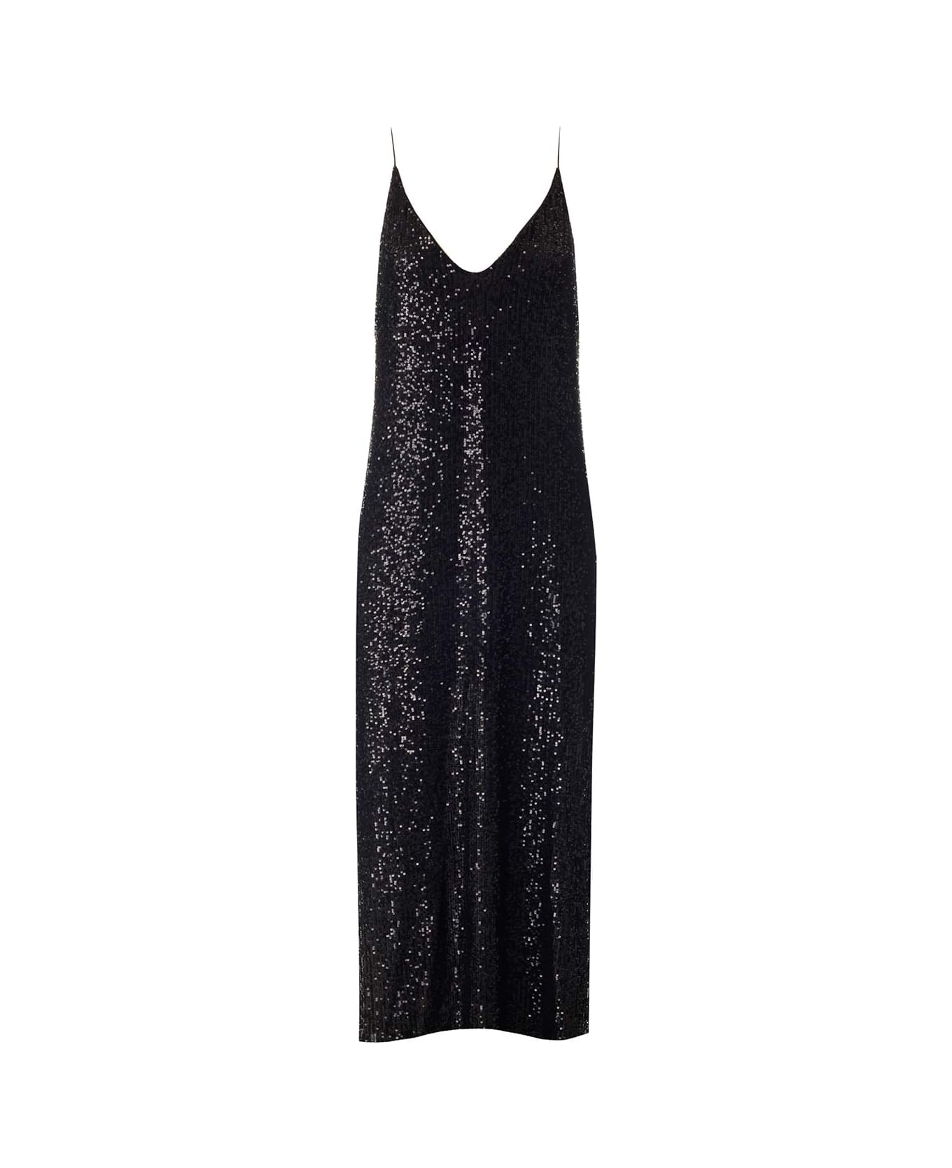 "Afrodite" midi dress from The Nina Studio entirely covered in black sequins, v-neck, thin straps and deep neckline on the back.
