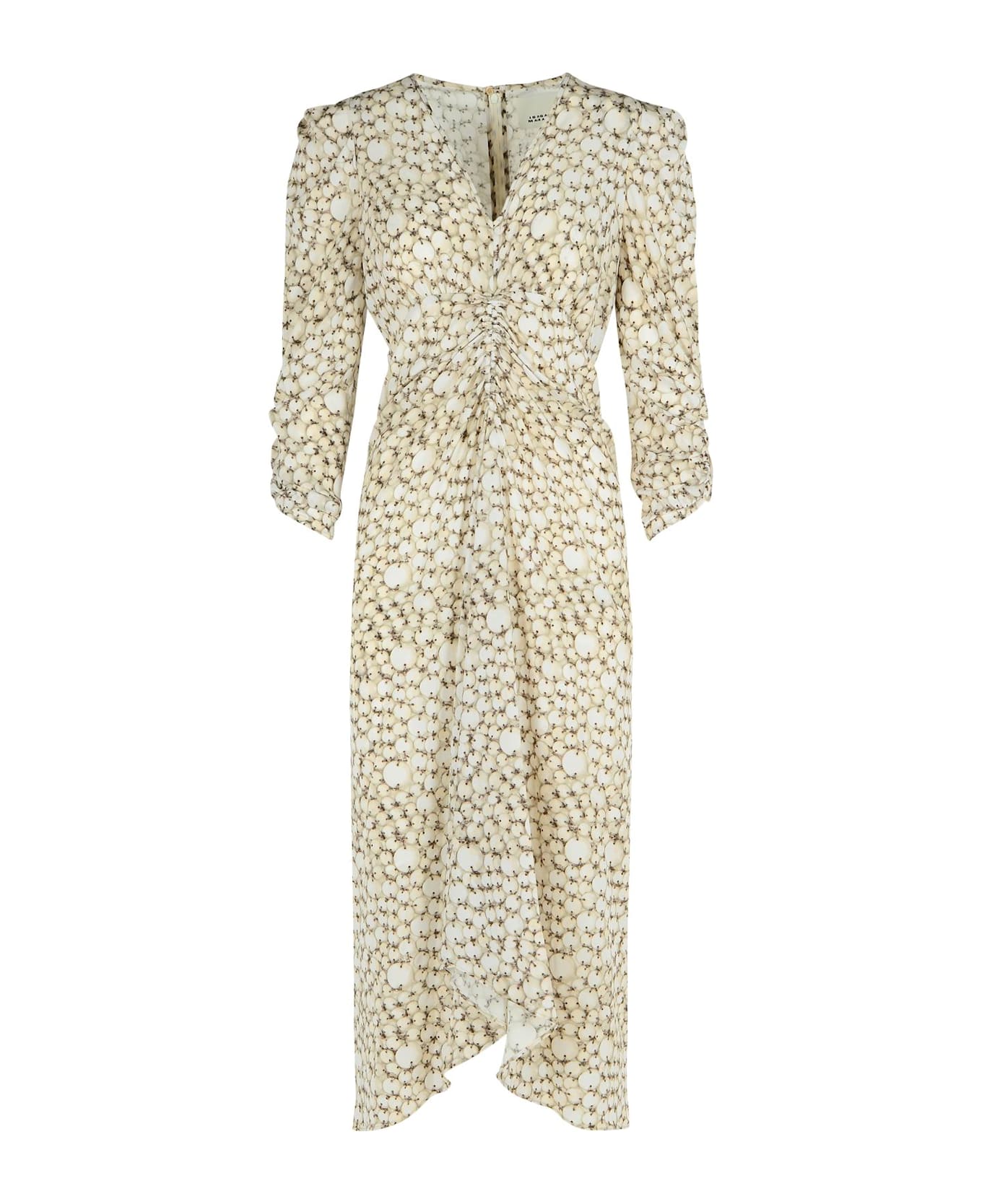Printed and curled silk blend midi dress with mosaic pattern, deep V-neck, structured shoulders with thin padding, '3/4' sleeves, draped and curled sleeves and waist, one button closure at the back and hidden zipper, asymmetrical hem, lightweight material with skirt lining, fluid cut, tight waistband