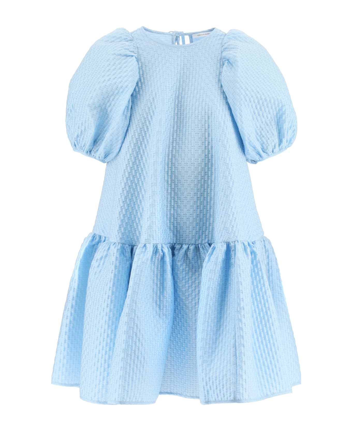 Cecilie Banhsen knee-length dress in Stria matelassé fabric, featuring a wide and flared cut with flounce hem. Short balloon sleeves, round neckline with back teardrop closure and laces to tie. Side inseam pockets. Cupro lining. The model is 177 cm tall and wears a size UK 8.