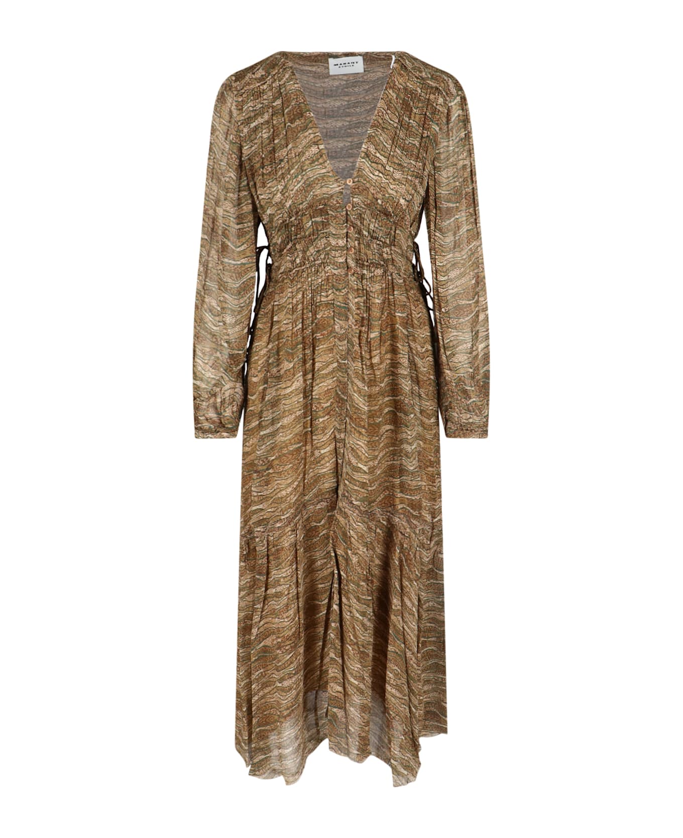 Isabel Marant Étoile 'Amara' draped maxi dress in green fabric with draped details, brindle print pattern, V-neck, long sleeves, button closure, adjustable drawstring at the waist, central front split, button cuffs, flared hem.