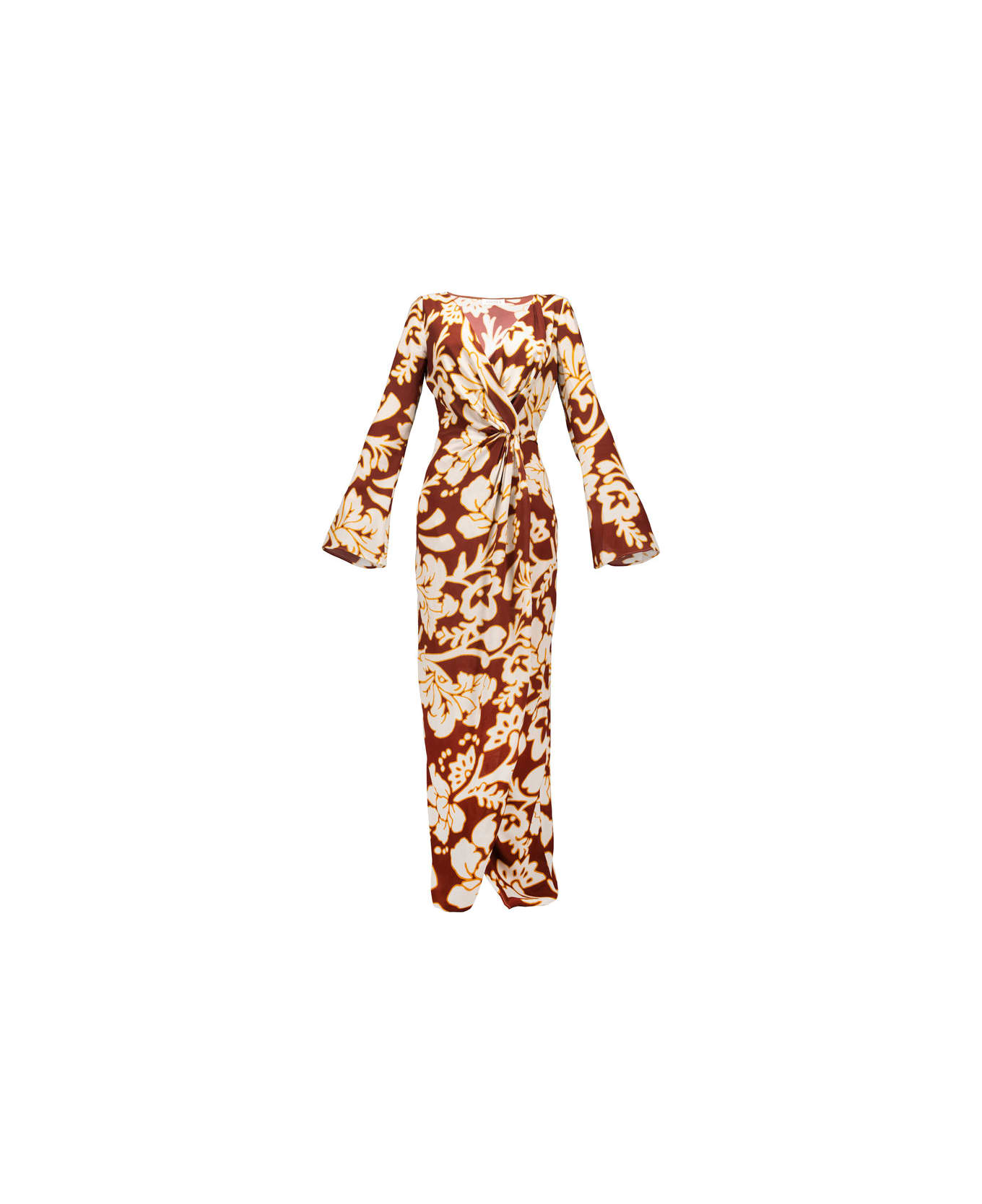 Amy long dress in burgundy viscose with white and yellow flower print. The Amy boasts a side knot on the front which creates soft drapes and a deep slit. The neckline plunges in a V and the long sleeves wide at the ends.