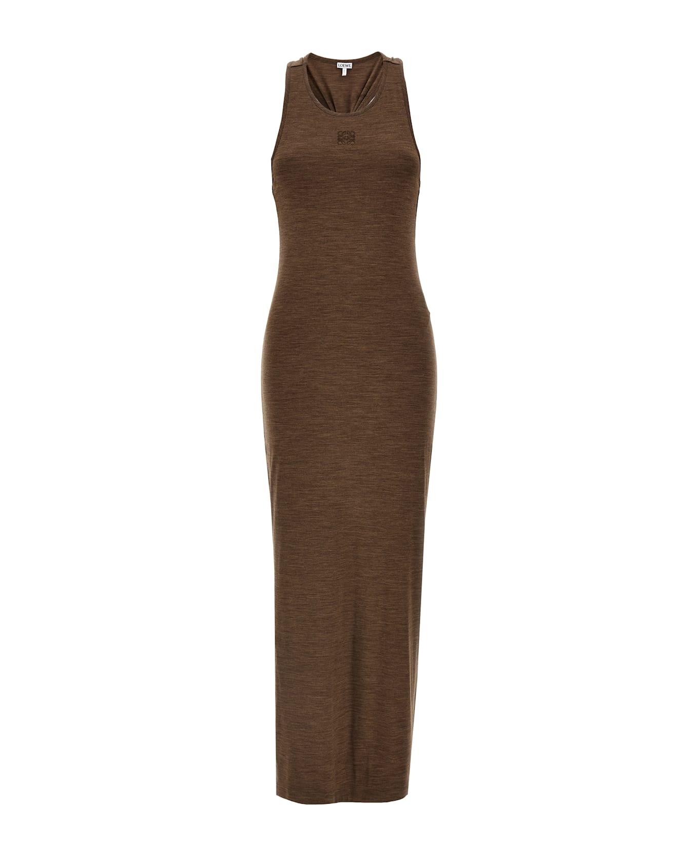 Long dress in light stretch mélange wool, tank top twisted on the back, front 'Anagram' embroidery, wide round neckline, side split.
