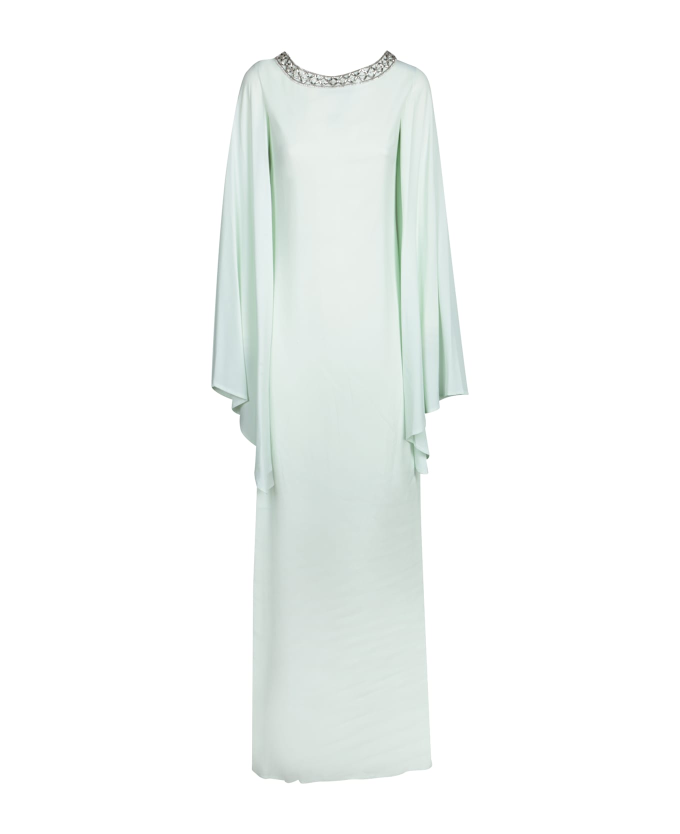 An elegant aqua green kaftan dress, embellished with a delicate crystal detail on the neckline, perfect for special occasions requiring a touch of class. Composition: 100% Glass, 87% Acetate, 7% Silk, 6% Elastane