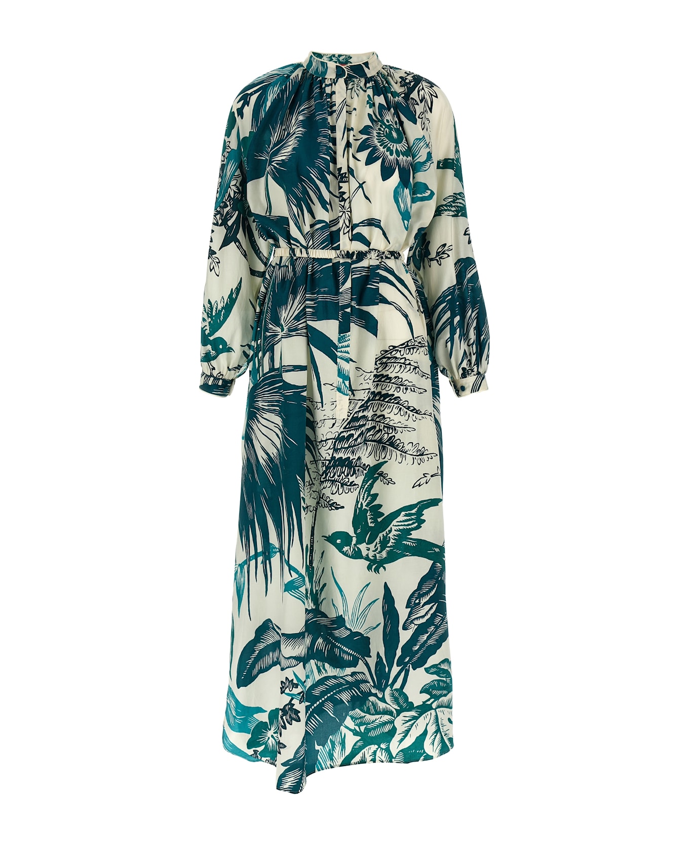Long 'Arione' dress in silk muslin and cotton with floral print with solid satin details, shirt style with mandarin collar, button closure, long sleeves, matching removable belt, side slits.