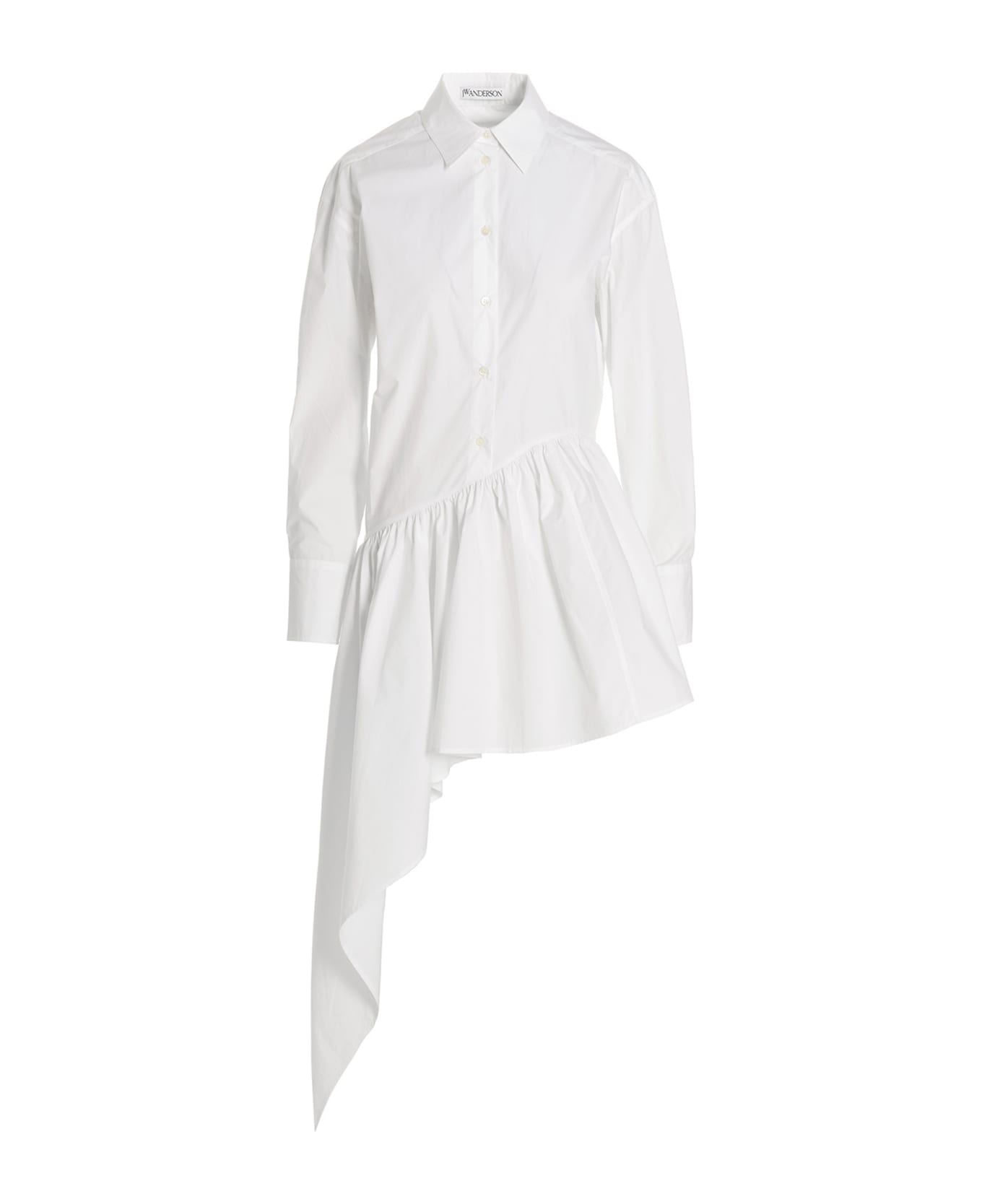 Asymmetric cotton shirt dress with long cuffed sleeves, low shoulders, chest pocket, flounced hemline, n embroidered tone-on-tone JWA logo and a button closure. closure. Composition: 100% cotton