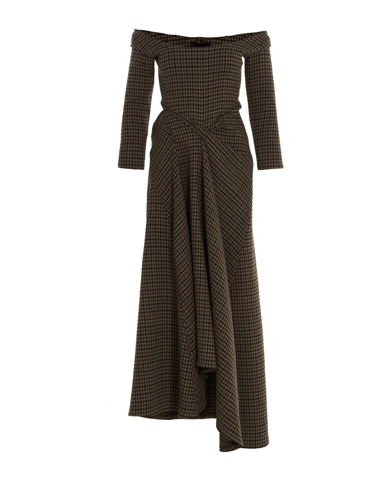 Wool blend dress with all-over gingham print, asymmetric style with draping, off-the-shoulder and 3/4 sleeves. eeves.