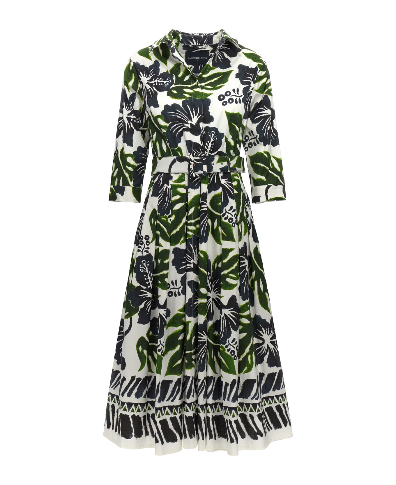 Cashmere' cotton poplin midi dress with all-over hibiscus print, shirt style with covered buttons, pleated skirt and 3/4 sleeves.