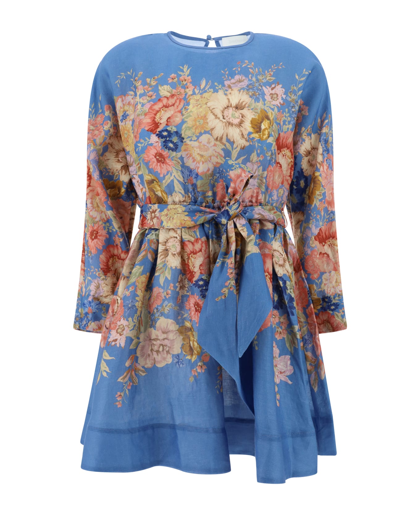 Linen august dress by zimmermann, mini design with ruffle skirt, back button closure, two side welt pockets, matching sash detail to tie at front, multicolored floral pattern.