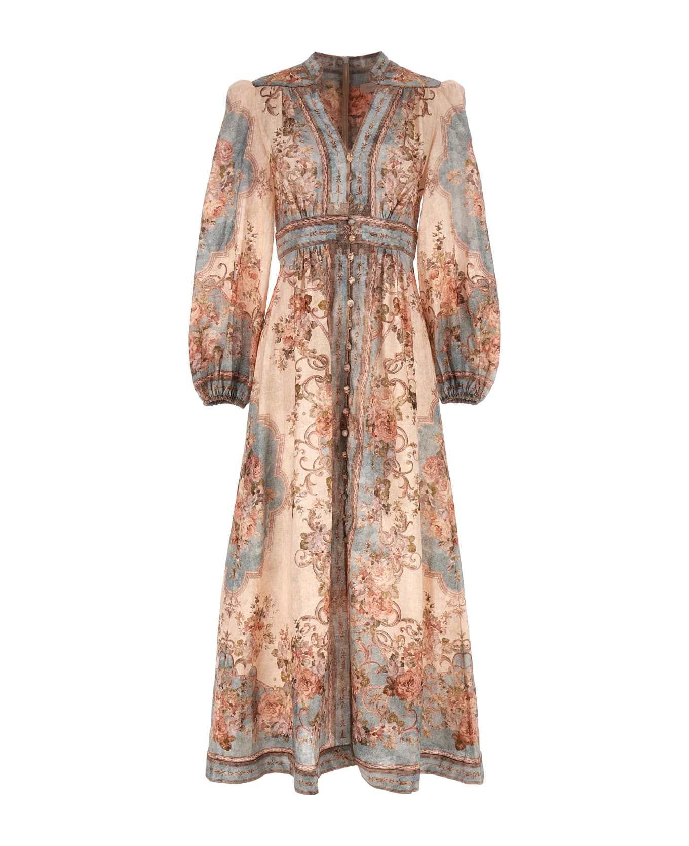 August Plunge Midi' all-over print linen dress, V-neck, long sleeves with elastic cuffs, front button closure, back zip closure.