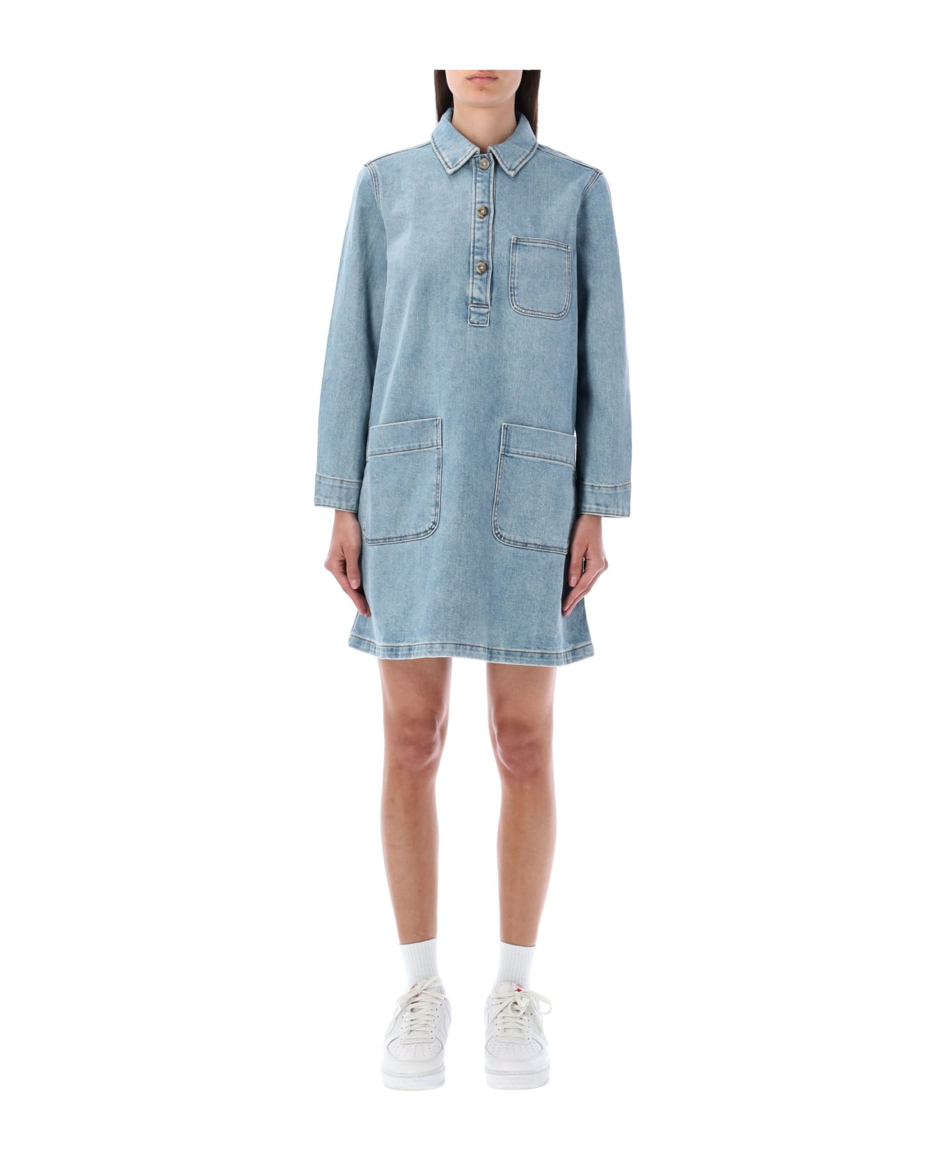 Aurelia Dress By A. p. c. Featuring: Flared Cut Mid-thigh Length Shirt-style Collar Three Button Fastening Long Sleeves Front Pockets And One Pocket On The Chest Topstitching Details Model Is 1,72 M Tall And She Is Wearing Size 36