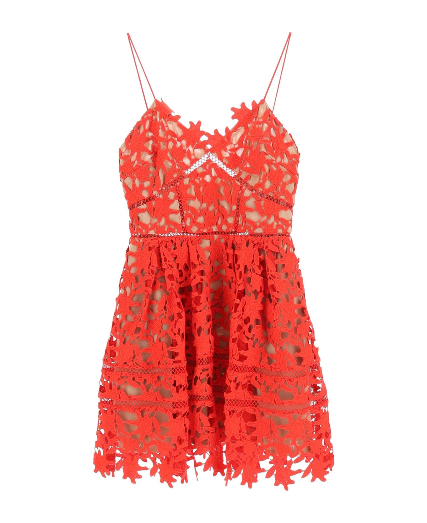 SELF-PORTRAIT dress floral lace with sweetheart neckline bodice and thin straps. The skirt is gathered at the waist with small pleats and goes down wide and flared with a scalloped hem. It features back closure with an exposed golden metal zip and a tonal stretch lycra lining. The model is 177 cm tall and wears a size 8 UK.