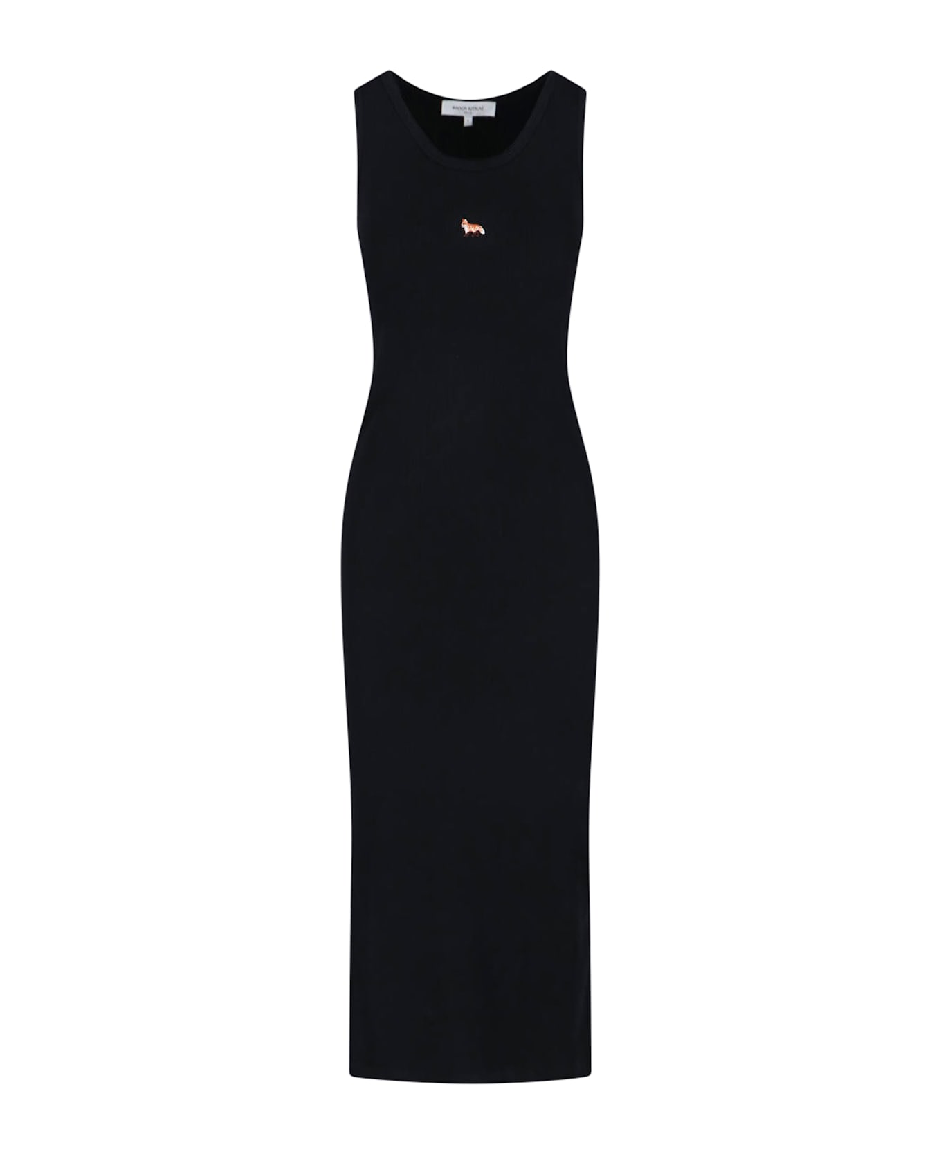Maison Kitsuné Baby Fox black ribbed cotton midi dress with round neckline, thin straps, multicolor logo embroidery on the chest, deep side slits, straight hem. Composition: 100% Cotton